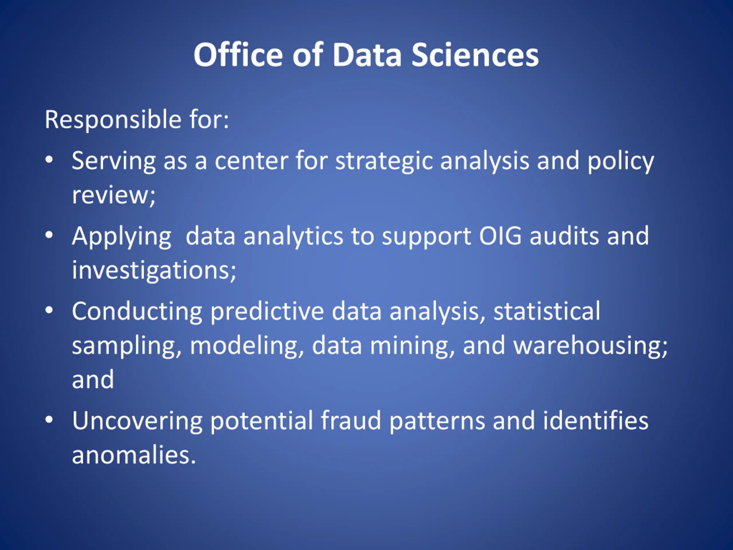 Office of Data Sciences Responsible for: Serving as a center for strategic analysis and policy review; Applying data analytics to support OIG audits and investigations; Conducting predictive data analysis, statistical sampling, modeling, data mining, and warehousing; and Uncovering potential fraud patterns and identifies anomalies.