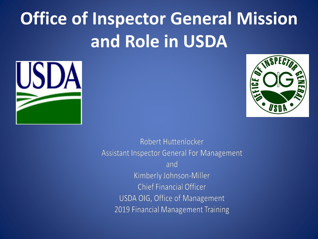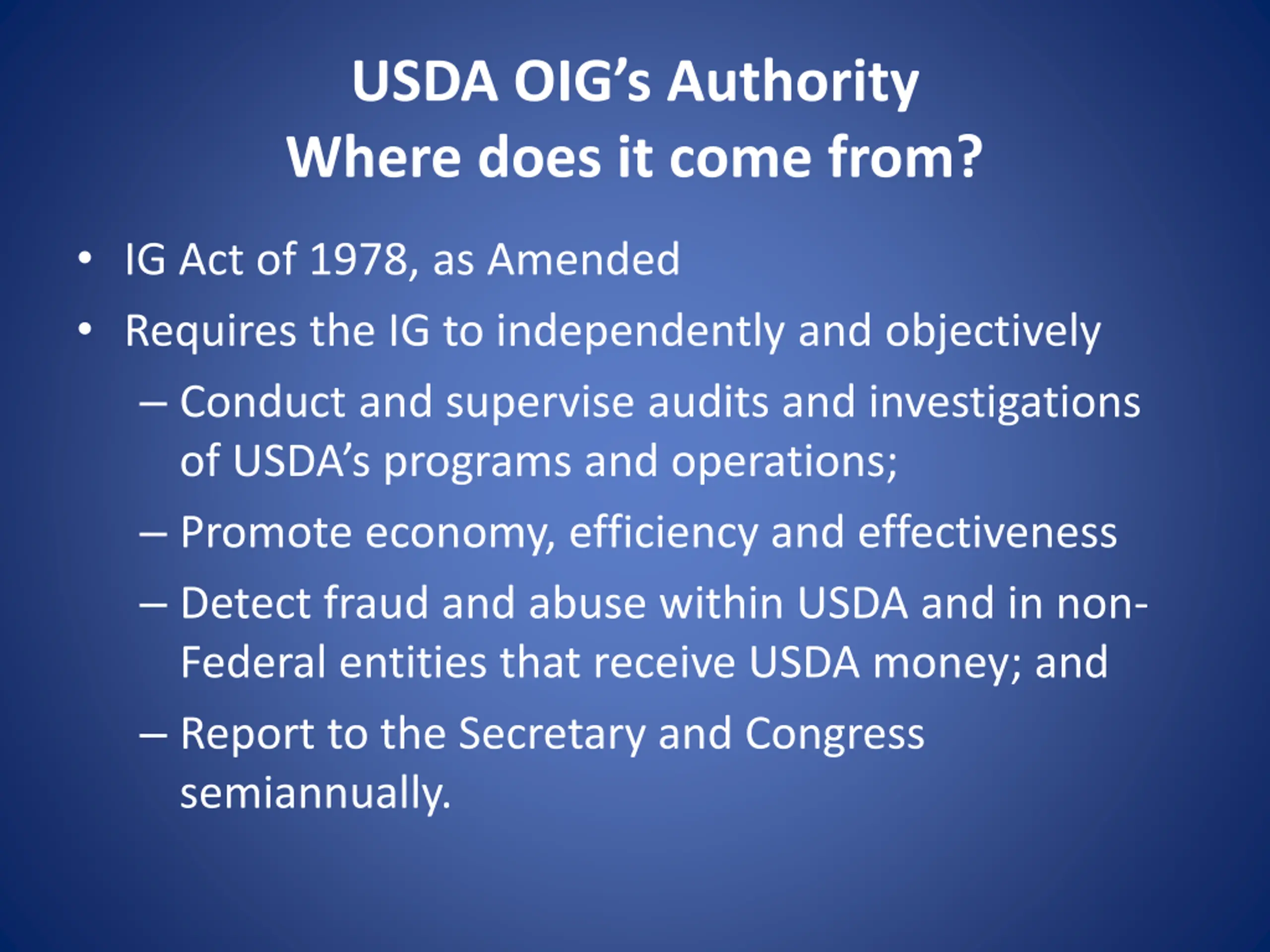 USDA OIGs Authority Where does it come from? IG Act of 1978, as Amended Requires the IG to independently and objectively Conduct and supervise audits and investigations of USDA s programs and operations; Promote economy, efficiency and effectiveness Detect fraud and abuse within USDA and in non- Federal entities that receive USDA money; and Report to the Secretary and Congress semiannually.