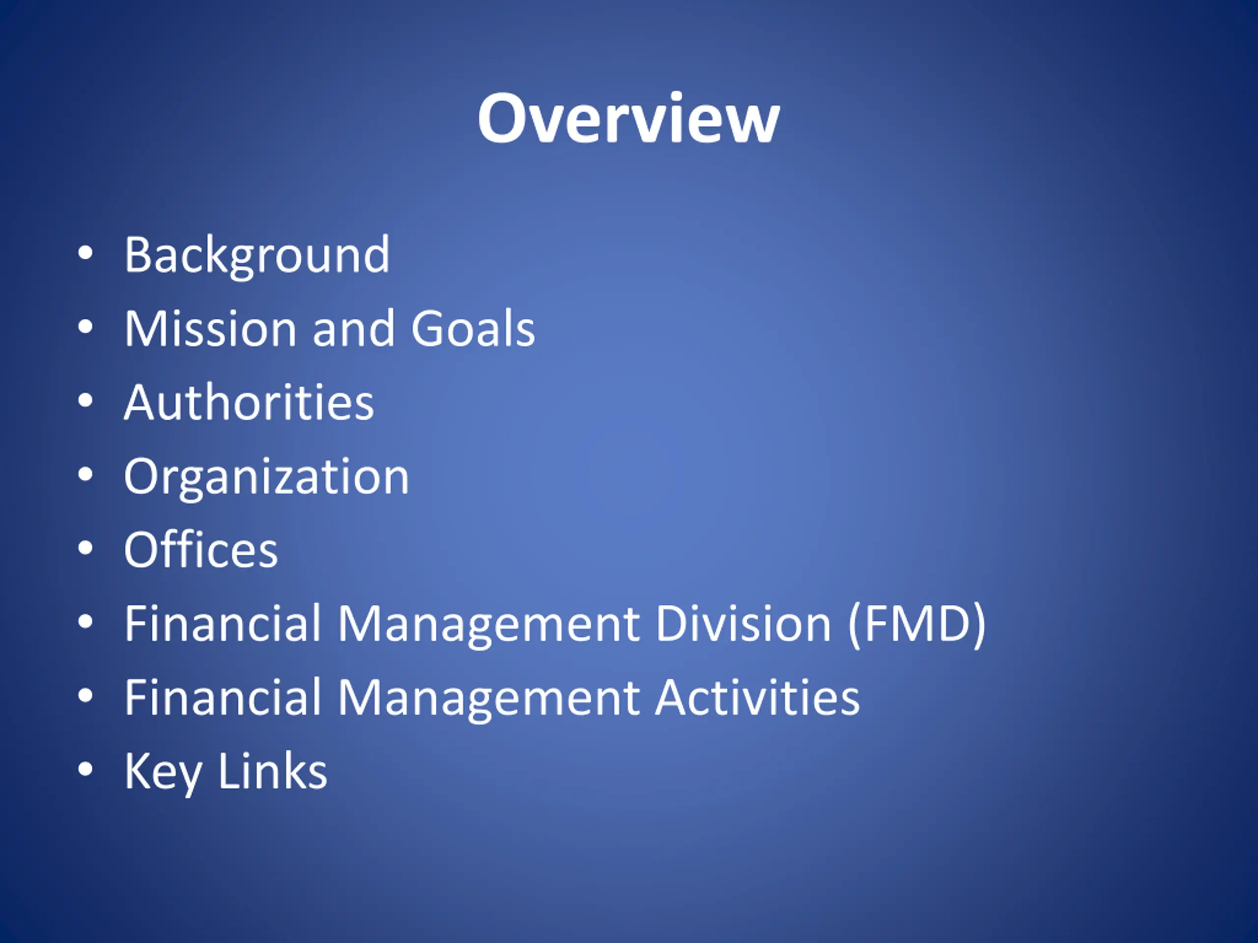 Overview Background Mission and Goals Authorities Organization Offices Financial Management Division (FMD) Financial Management Activities Key Links