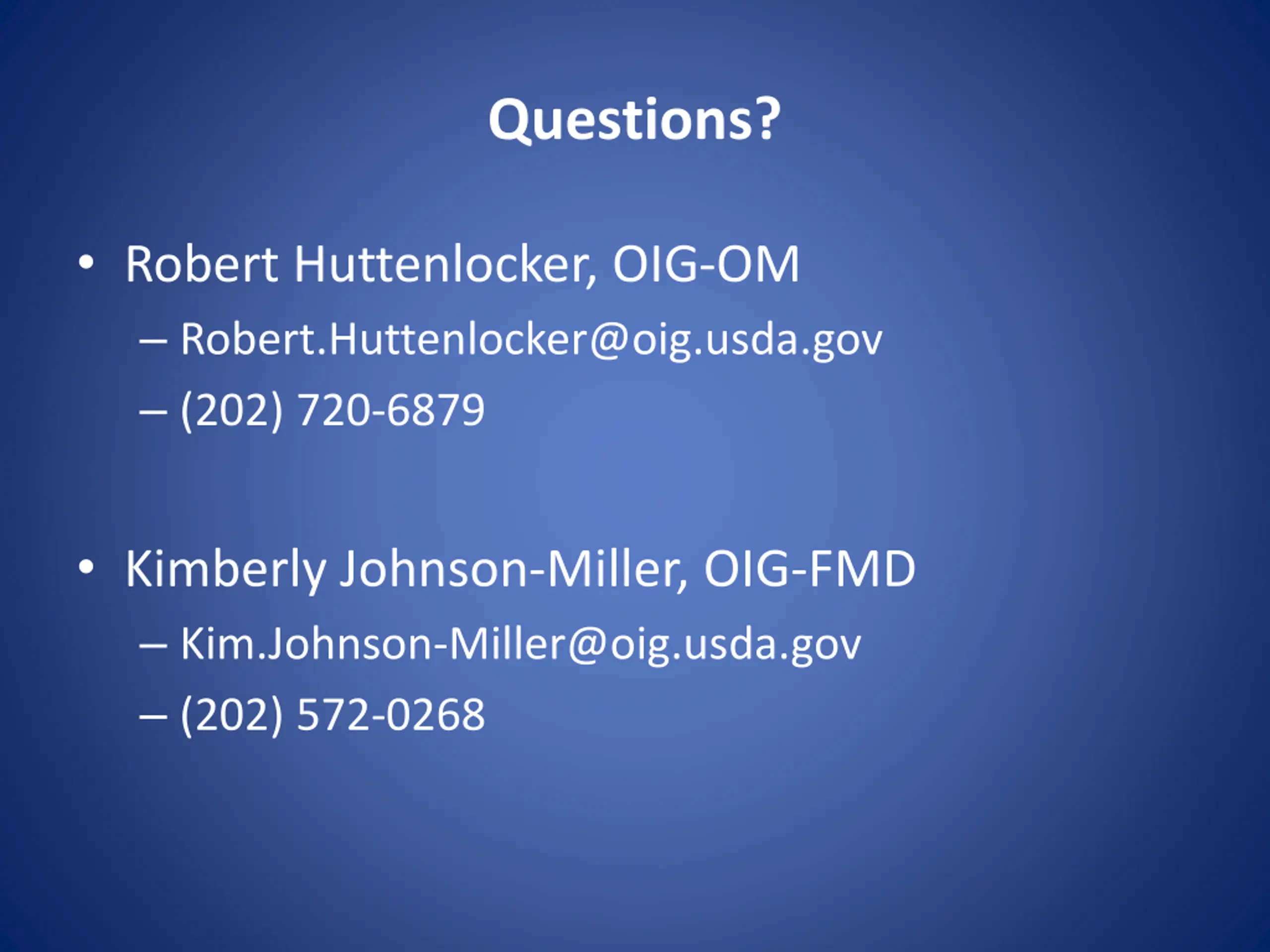 Questions? Robert Huttenlocker, OIG-OM Robert.Huttenlocker@oig.usda.gov (202) 720-6879 Kimberly Johnson-Miller, OIG-FMD Kim.Johnson-Miller@oig.usda.gov (202) 572-0268