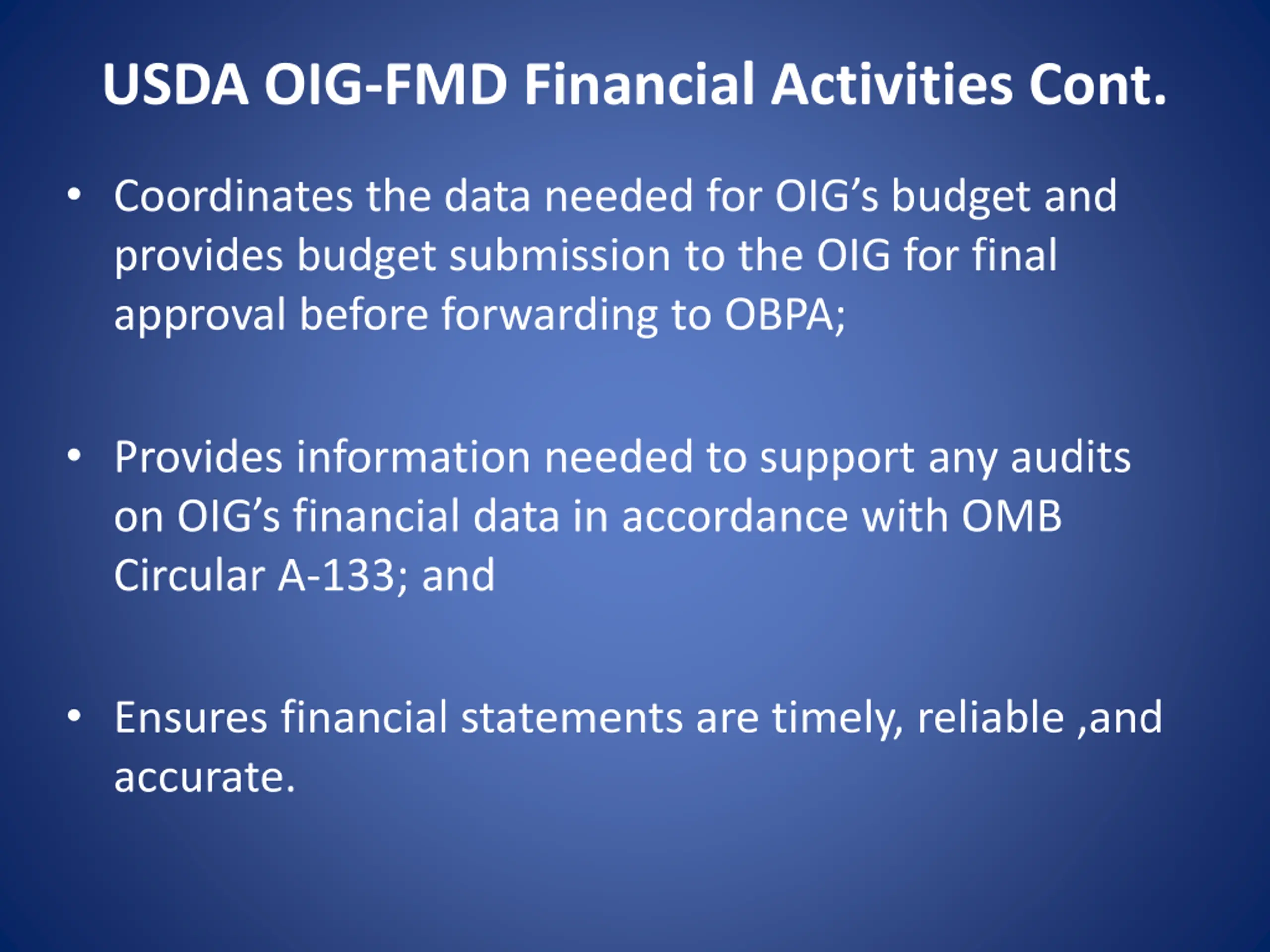USDA OIG-FMD Financial Activities Cont. Coordinates the data needed for OIG s budget and provides budget submission to the OIG for final approval before forwarding to OBPA; Provides information needed to support any audits on OIG s financial data in accordance with OMB Circular A-133; and Ensures financial statements are timely, reliable ,and accurate.