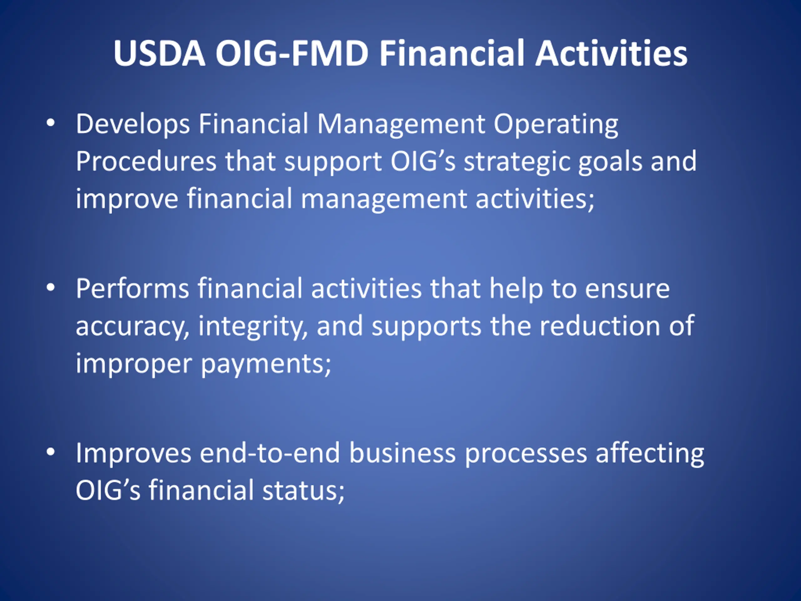 USDA OIG-FMD Financial Activities Develops Financial Management Operating Procedures that support OIG s strategic goals and improve financial management activities; Performs financial activities that help to ensure accuracy, integrity, and supports the reduction of improper payments; Improves end-to-end business processes affecting OIG s financial status;