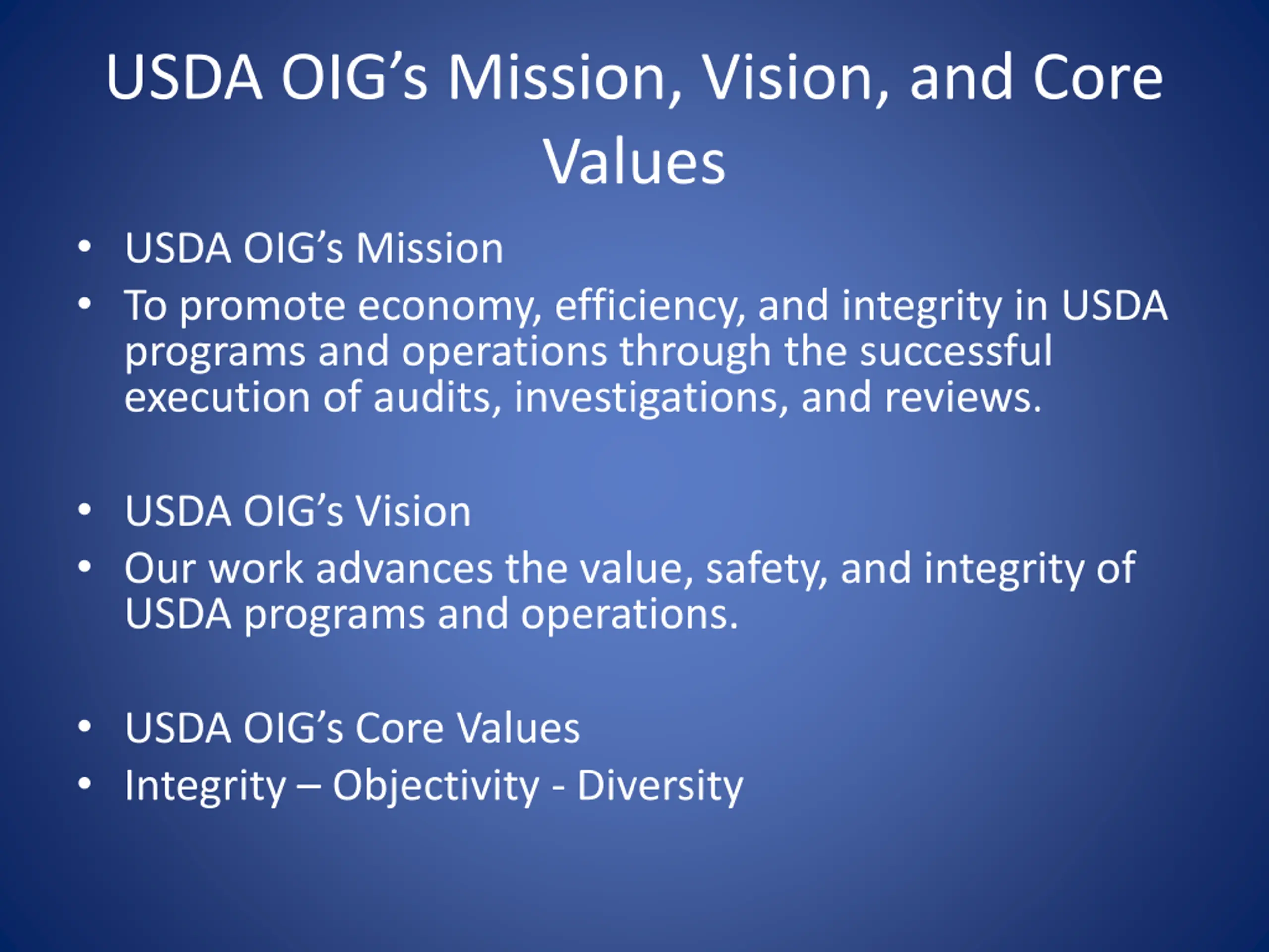 USDA OIGs Mission, Vision, and Core Values USDA OIG s Mission To promote economy, efficiency, and integrity in USDA programs and operations through the successful execution of audits, investigations, and reviews. USDA OIG s Vision Our work advances the value, safety, and integrity of USDA programs and operations. USDA OIG s Core Values Integrity Objectivity - Diversity