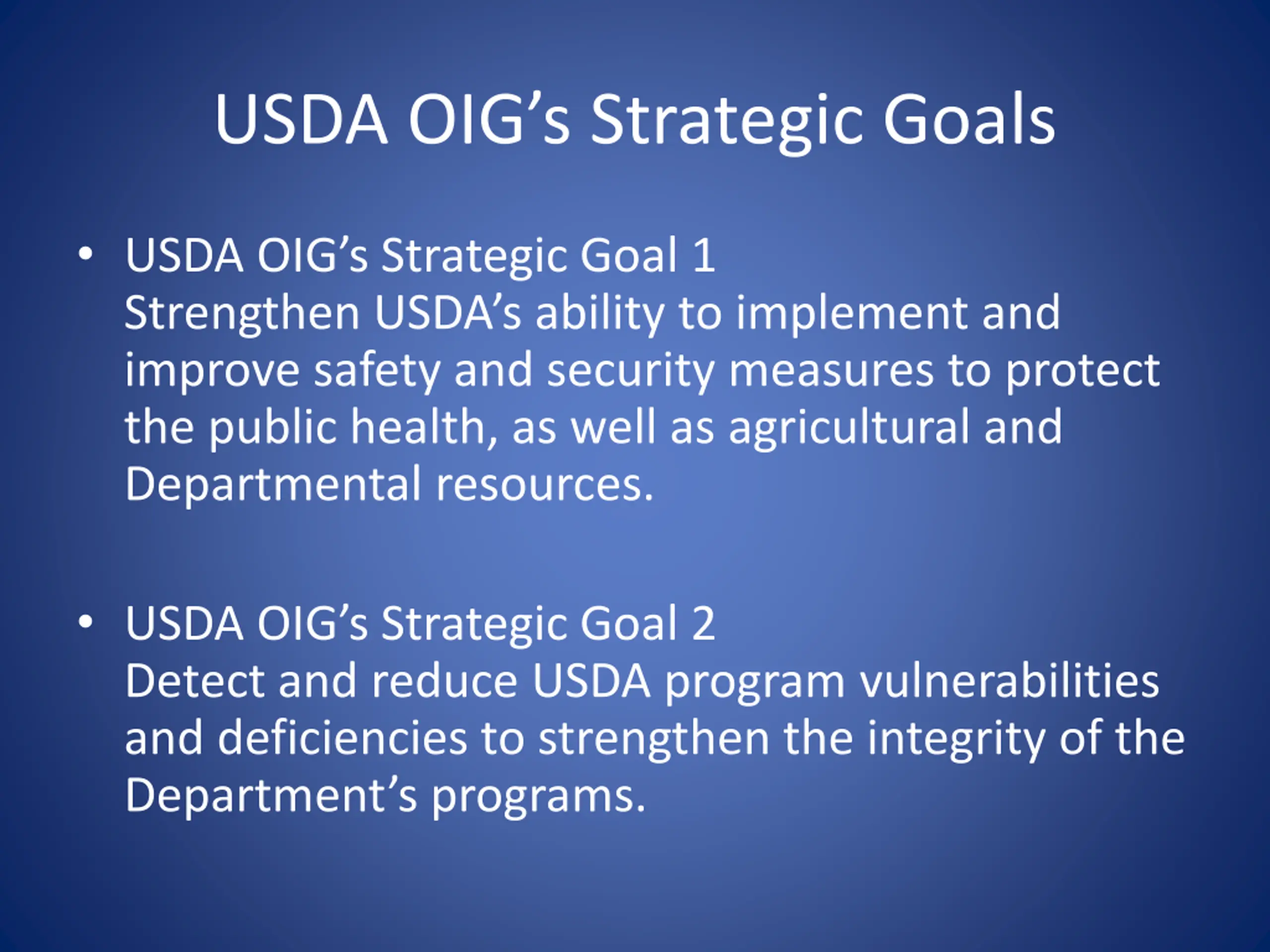USDA OIGs Strategic Goals USDA OIG s Strategic Goal 1 Strengthen USDA s ability to implement and improve safety and security measures to protect the public health, as well as agricultural and Departmental resources. USDA OIG s Strategic Goal 2 Detect and reduce USDA program vulnerabilities and deficiencies to strengthen the integrity of the Department s programs.