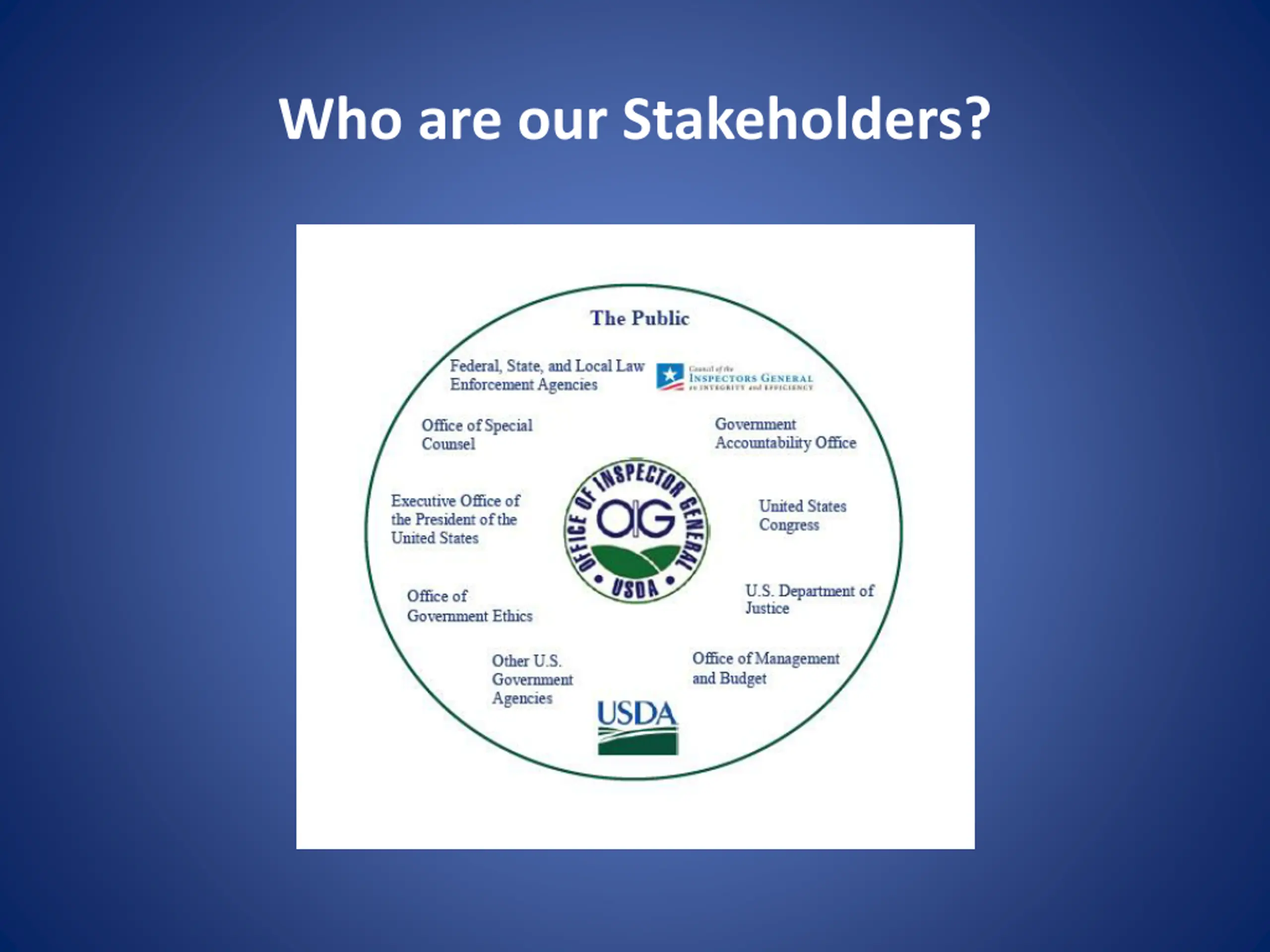 USDA OIGs Strategic Goals (cont) USDA OIG s Strategic Goal 3 Provide USDA with oversight to help it achieve results-oriented performance. USDA OIG s Strategic Goal 4 Recruit, develop, and maintain a highly qualified and diverse workforce while fostering a work environment that promotes productivity, innovation, excellence, and employee satisfaction.