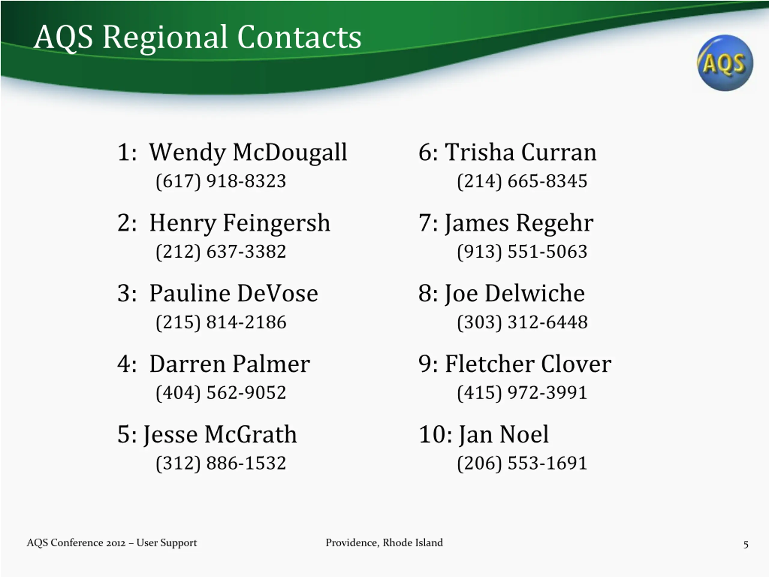 AQS Regional Contacts 1: Wendy McDougall (617) 918-8323 6: Trisha Curran (214) 665-8345 2: Henry Feingersh (212) 637-3382 7: James Regehr (913) 551-5063 3: Pauline DeVose (215) 814-2186 8: Joe Delwiche (303) 312-6448 4: Darren Palmer (404) 562-9052 9: Fletcher Clover (415) 972-3991 5: Jesse McGrath (312) 886-1532 10: Jan Noel (206) 553-1691 AQS Conference 2012 User Support Providence, Rhode Island 5