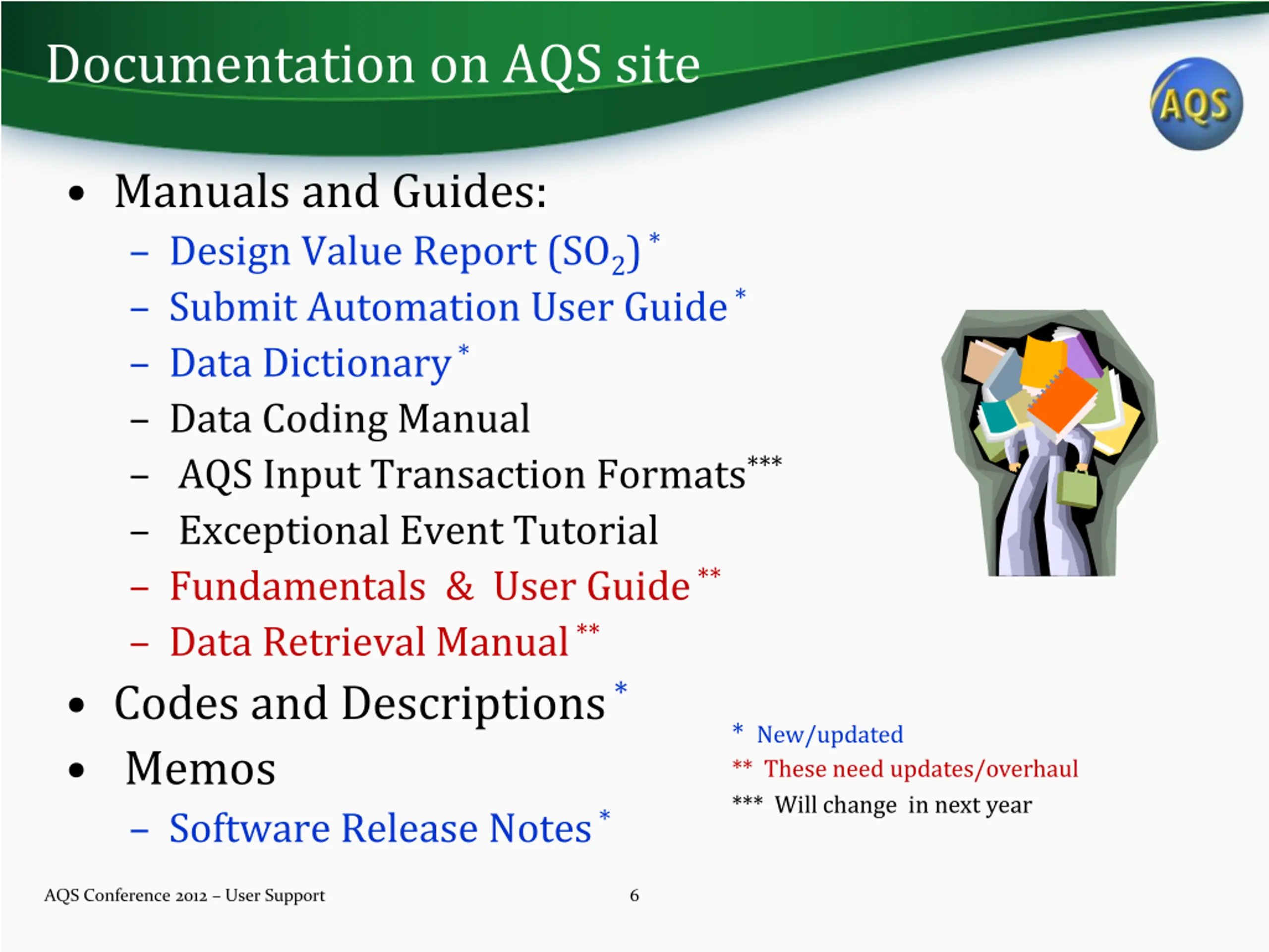 Documentation on AQS site Manuals and Guides: Design Value Report (SO2) * Submit Automation User Guide * Data Dictionary * Data Coding Manual AQS Input Transaction Formats*** Exceptional Event Tutorial Fundamentals & User Guide ** Data Retrieval Manual ** Codes and Descriptions * Memos Software Release Notes * * New/updated ** These need updates/overhaul *** Will change in next year AQS Conference 2012 User Support 6