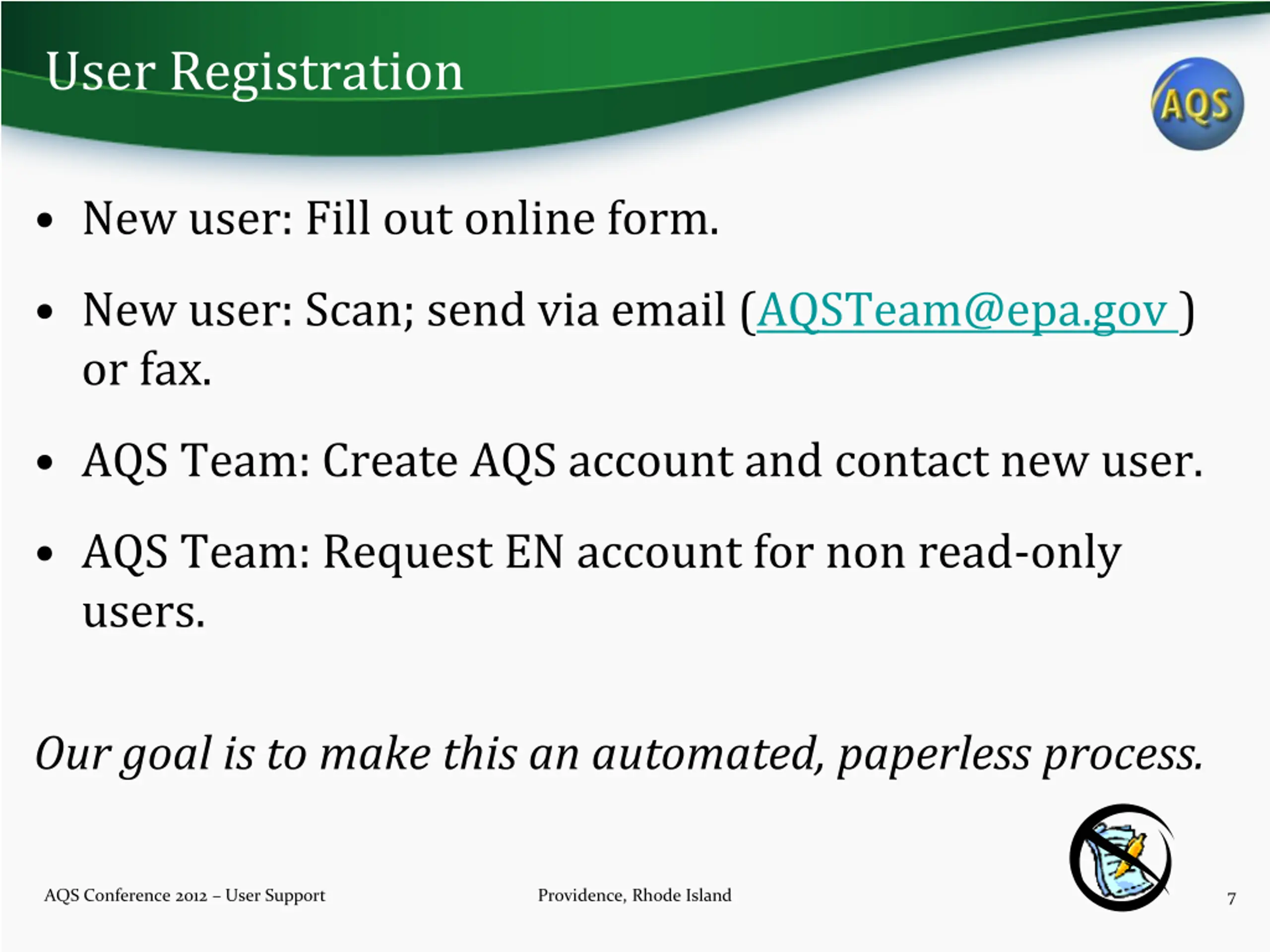 User Registration New user: Fill out online form. New user: Scan; send via email (AQSTeam@epa.gov ) or fax. AQS Team: Create AQS account and contact new user. AQS Team: Request EN account for non read-only users. Our goal is to make this an automated, paperless process. AQS Conference 2012 User Support Providence, Rhode Island 7