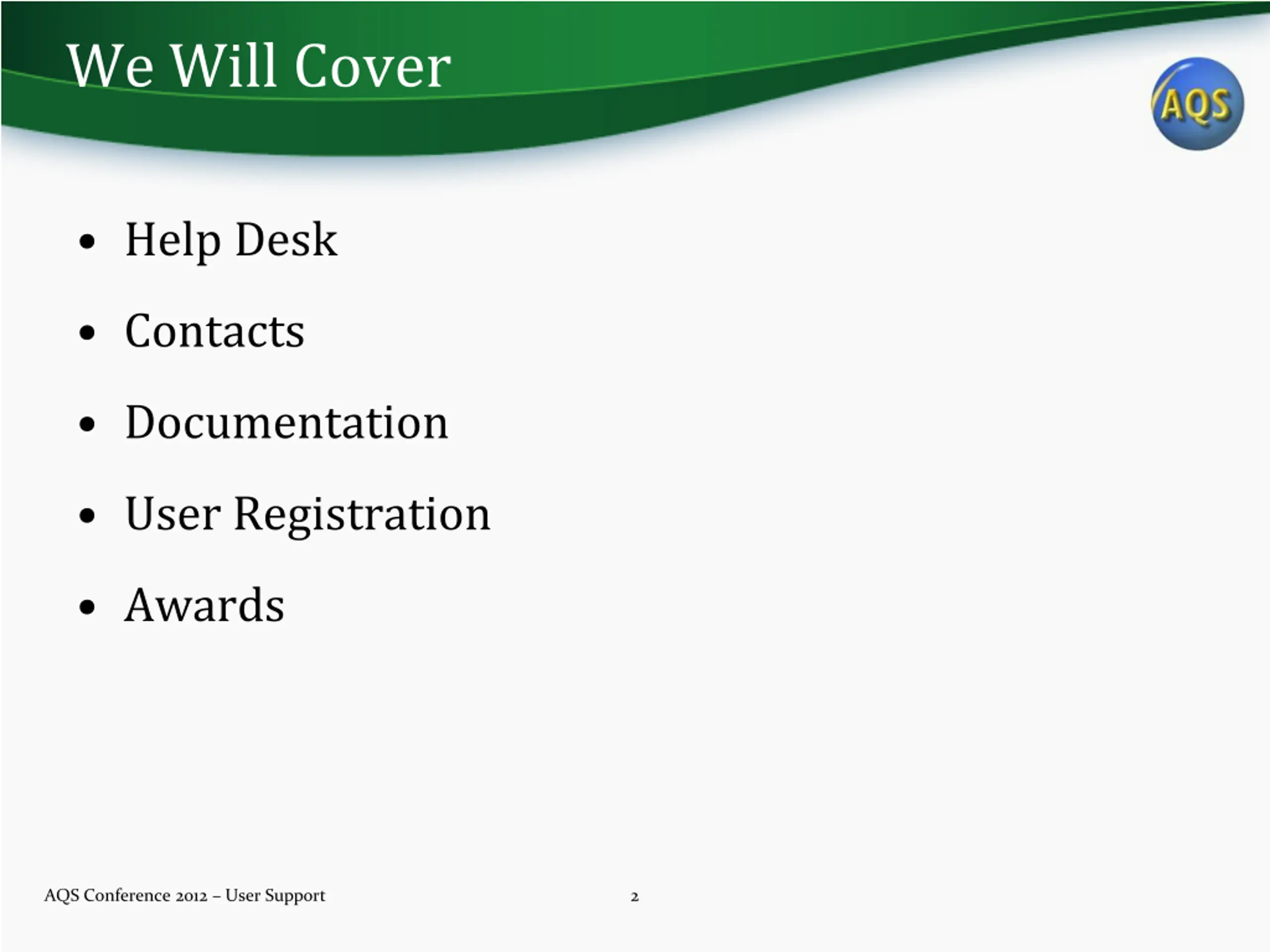 We Will Cover Help Desk Contacts Documentation User Registration Awards AQS Conference 2012 User Support 2