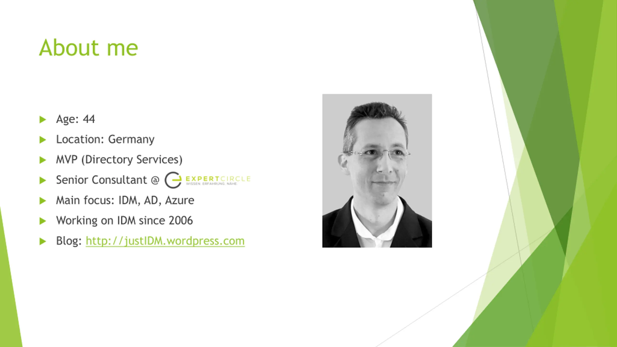 About me Age: 44 Location: Germany MVP (Directory Services) Senior Consultant @ Main focus: IDM, AD, Azure Working on IDM since 2006 Blog: http://justIDM.wordpress.com