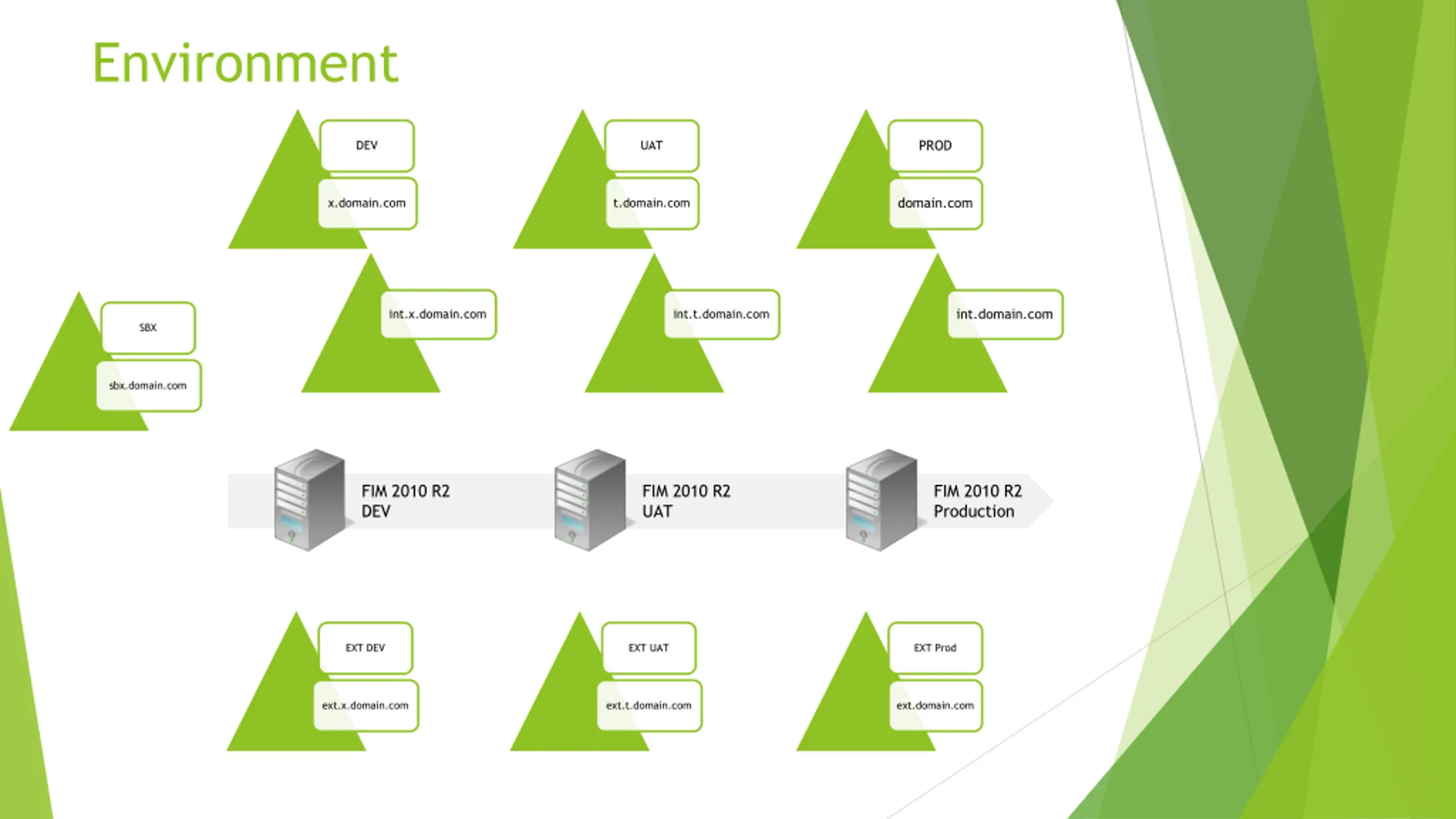 Environment PROD DEV UAT domain.com x.domain.com t.domain.com int.domain.com int.x.domain.com int.t.domain.com SBX sbx.domain.com FIM 2010 R2 DEV FIM 2010 R2 UAT FIM 2010 R2 Production EXT DEV EXT UAT EXT Prod ext.x.domain.com ext.t.domain.com ext.domain.com