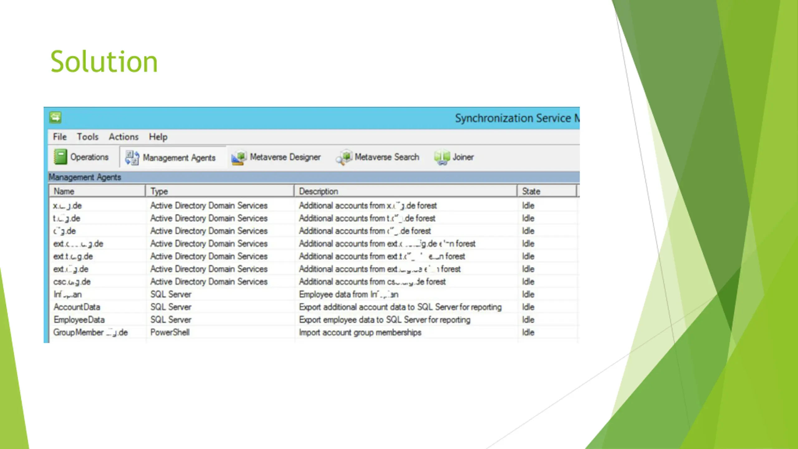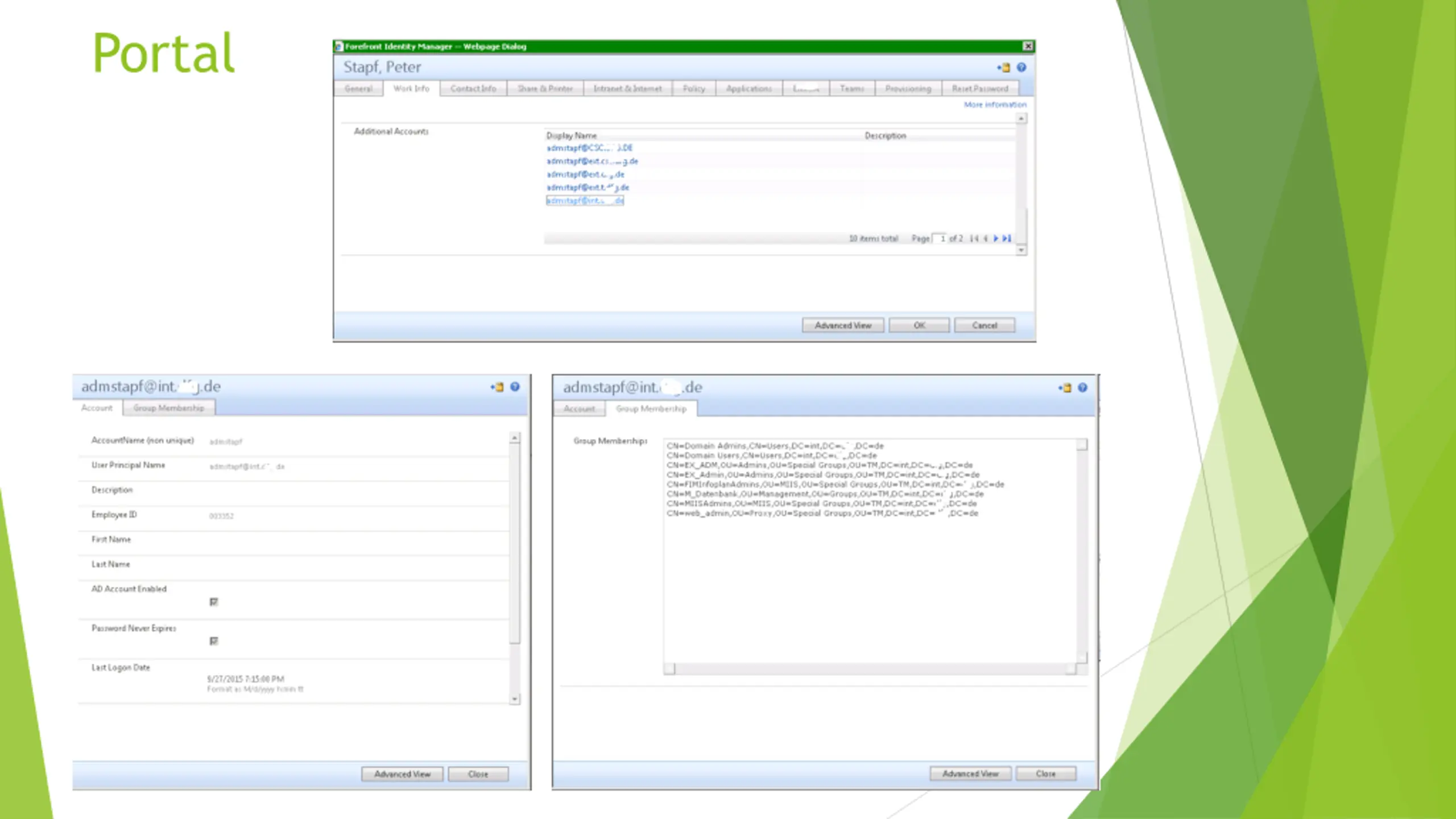 Environmental facts Internal Forests External Forests 1200 Users 80000 Users 2500 Groups 5 major roles/groups 3000 Contacts Users grow 250/week Admin accounts in each domain Admin accounts in each domain Additional personalized accounts Additional personalized accounts Historical facts Implemented in 2004 with MIIS Currently 25 Management Agents Migrated to ILM, FIM, FIM R2, (MIM) Re-use DB all the time Portal for Admin, Helpdesk, Team management