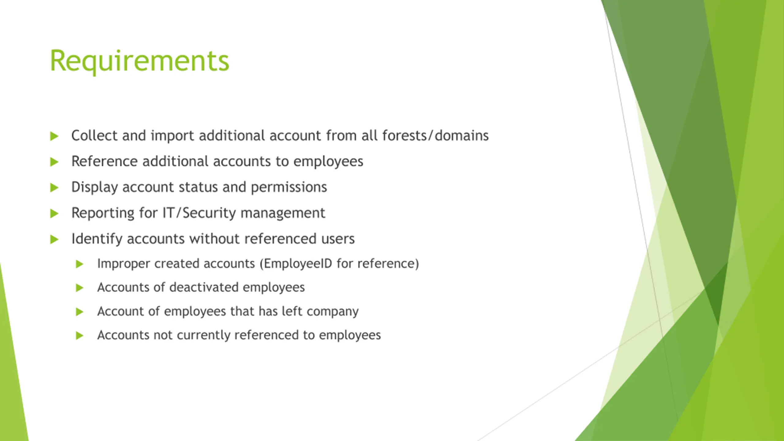 Requirements Collect and import additional account from all forests/domains Reference additional accounts to employees Display account status and permissions Reporting for IT/Security management Identify accounts without referenced users Improper created accounts (EmployeeID for reference) Accounts of deactivated employees Account of employees that has left company Accounts not currently referenced to employees