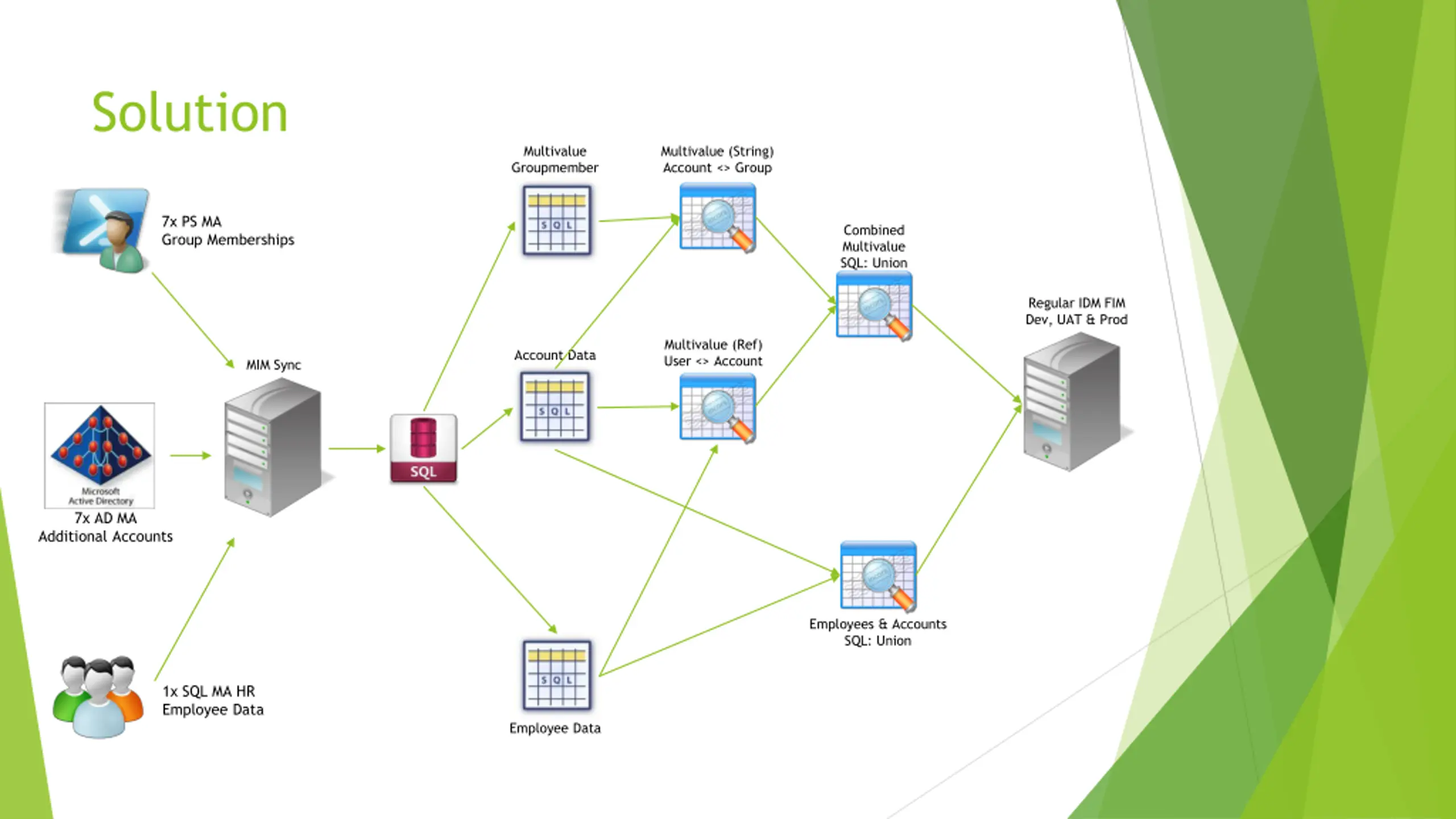 Solution Multivalue Groupmember Multivalue (String) Account <> Group 7x PS MA Group Memberships Combined Multivalue SQL: Union Regular IDM FIM Dev, UAT & Prod Multivalue (Ref) User <> Account Account Data MIM Sync 7x AD MA Additional Accounts Employees & Accounts SQL: Union 1x SQL MA HR Employee Data Employee Data