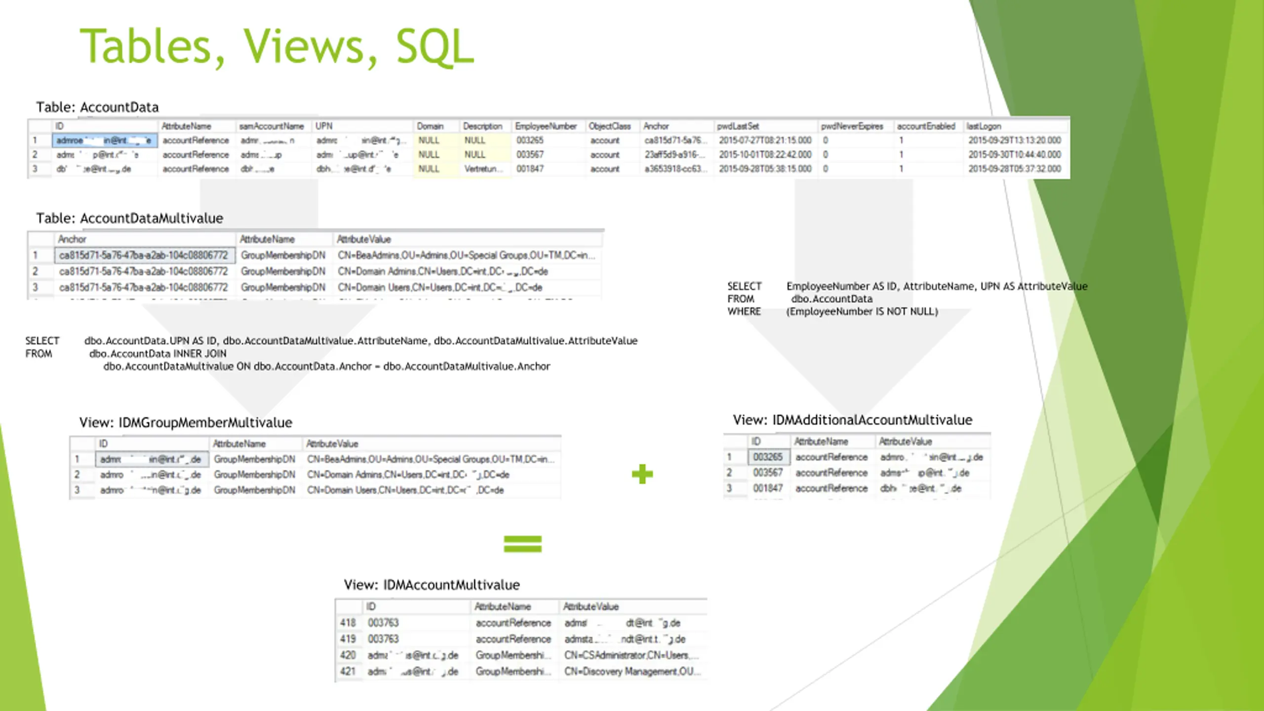 Tables, Views, SQL Table: AccountData Table: AccountDataMultivalue SELECT EmployeeNumber AS ID, AttributeName, UPN AS AttributeValue FROM dbo.AccountData WHERE (EmployeeNumber IS NOT NULL) SELECT dbo.AccountData.UPN AS ID, dbo.AccountDataMultivalue.AttributeName, dbo.AccountDataMultivalue.AttributeValue FROM dbo.AccountData INNER JOIN dbo.AccountDataMultivalue ON dbo.AccountData.Anchor = dbo.AccountDataMultivalue.Anchor View: IDMAdditionalAccountMultivalue View: IDMGroupMemberMultivalue View: IDMAccountMultivalue
