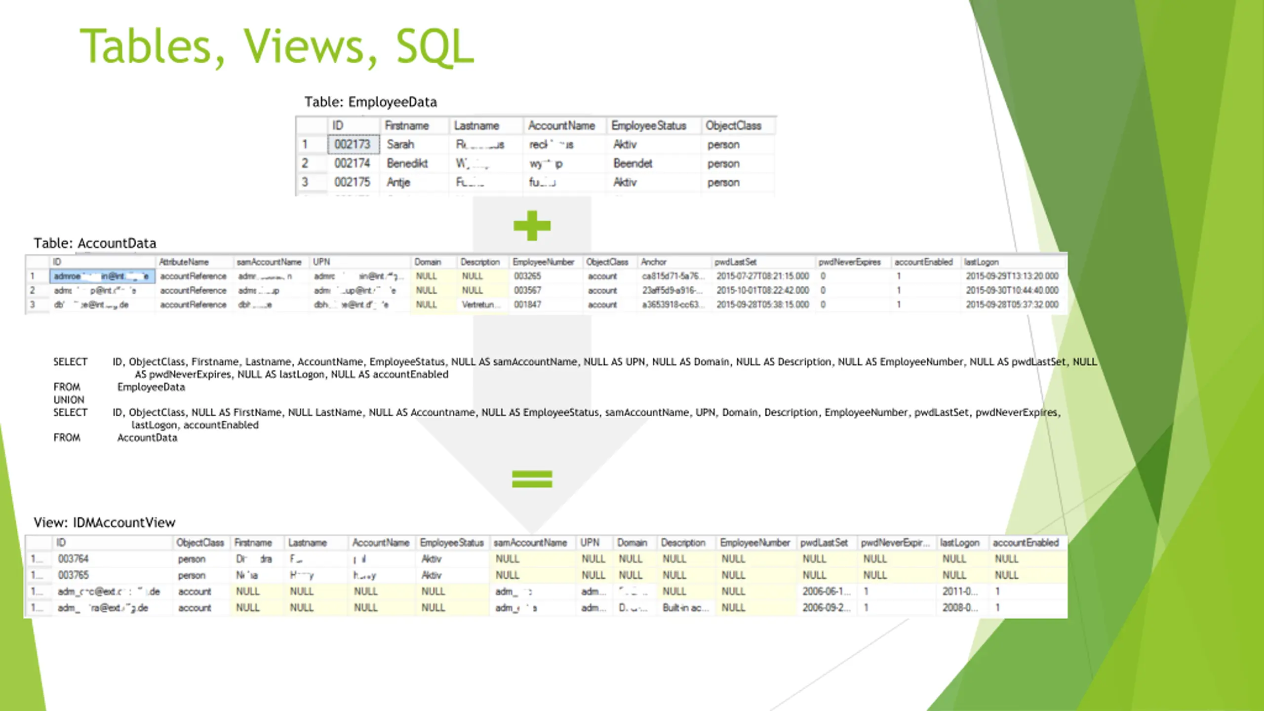 Tables, Views, SQL Table: EmployeeData Table: AccountData SELECT ID, ObjectClass, Firstname, Lastname, AccountName, EmployeeStatus, NULL AS samAccountName, NULL AS UPN, NULL AS Domain, NULL AS Description, NULL AS EmployeeNumber, NULL AS pwdLastSet, NULL AS pwdNeverExpires, NULL AS lastLogon, NULL AS accountEnabled FROM EmployeeData UNION SELECT ID, ObjectClass, NULL AS FirstName, NULL LastName, NULL AS Accountname, NULL AS EmployeeStatus, samAccountName, UPN, Domain, Description, EmployeeNumber, pwdLastSet, pwdNeverExpires, lastLogon, accountEnabled FROM AccountData View: IDMAccountView