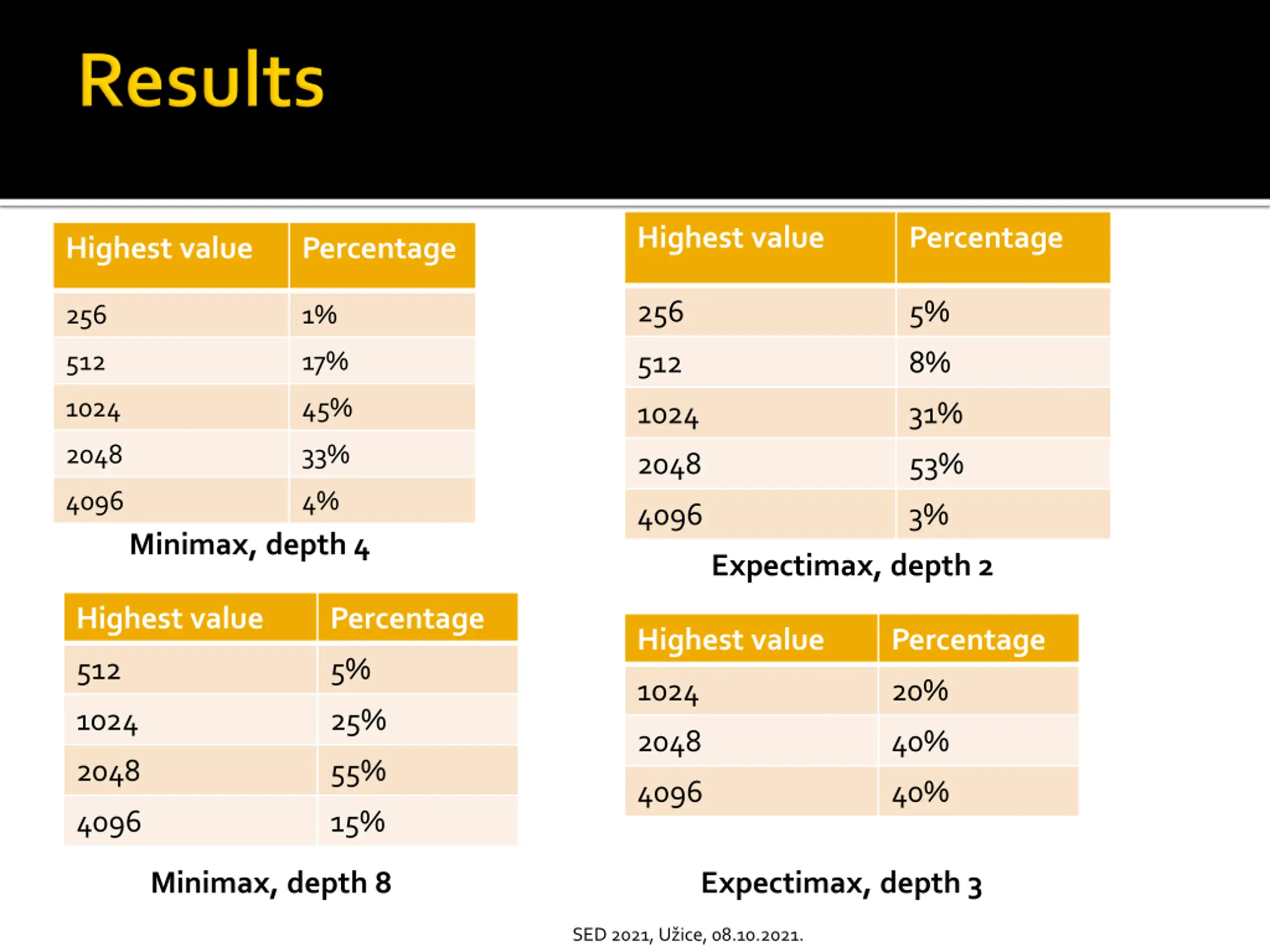Highest value Percentage Highest value Percentage 256 5% 256 1% 512 8% 512 17% 1024 45% 1024 31% 2048 33% 2048 53% 4096 4% 4096 3% Minimax, depth 4 Expectimax, depth 2 Highest value Percentage Highest value Percentage 512 5% 1024 20% 1024 25% 2048 40% 2048 55% 4096 40% 4096 15% Minimax, depth 8 Expectimax, depth 3 SED2021, U ice, 08.10.2021.
