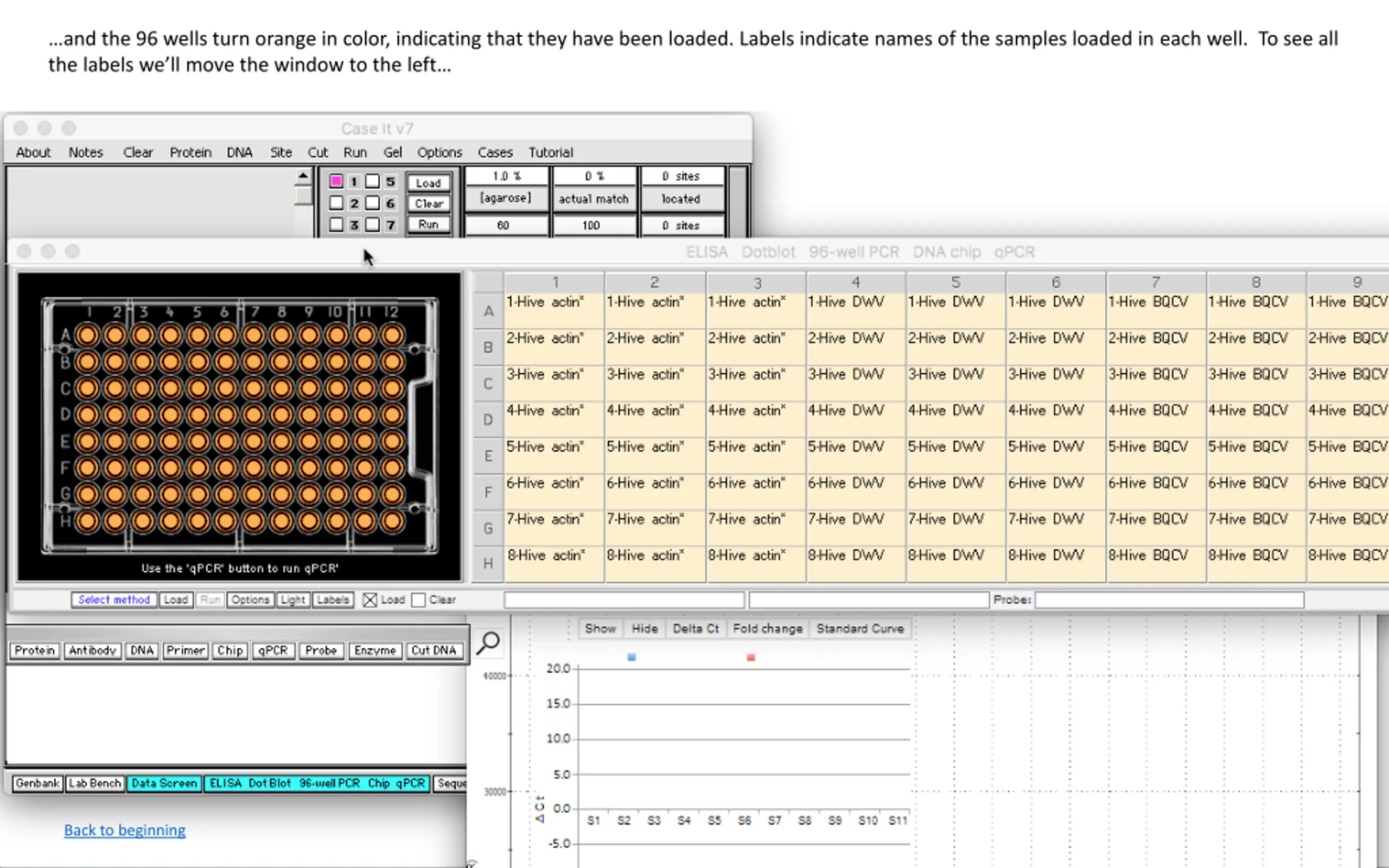 and the 96 wells turn orange in color, indicating that they have been loaded. Labels indicate names of the samples loaded in each well. To see all the labels we ll move the window to the left Back to beginning