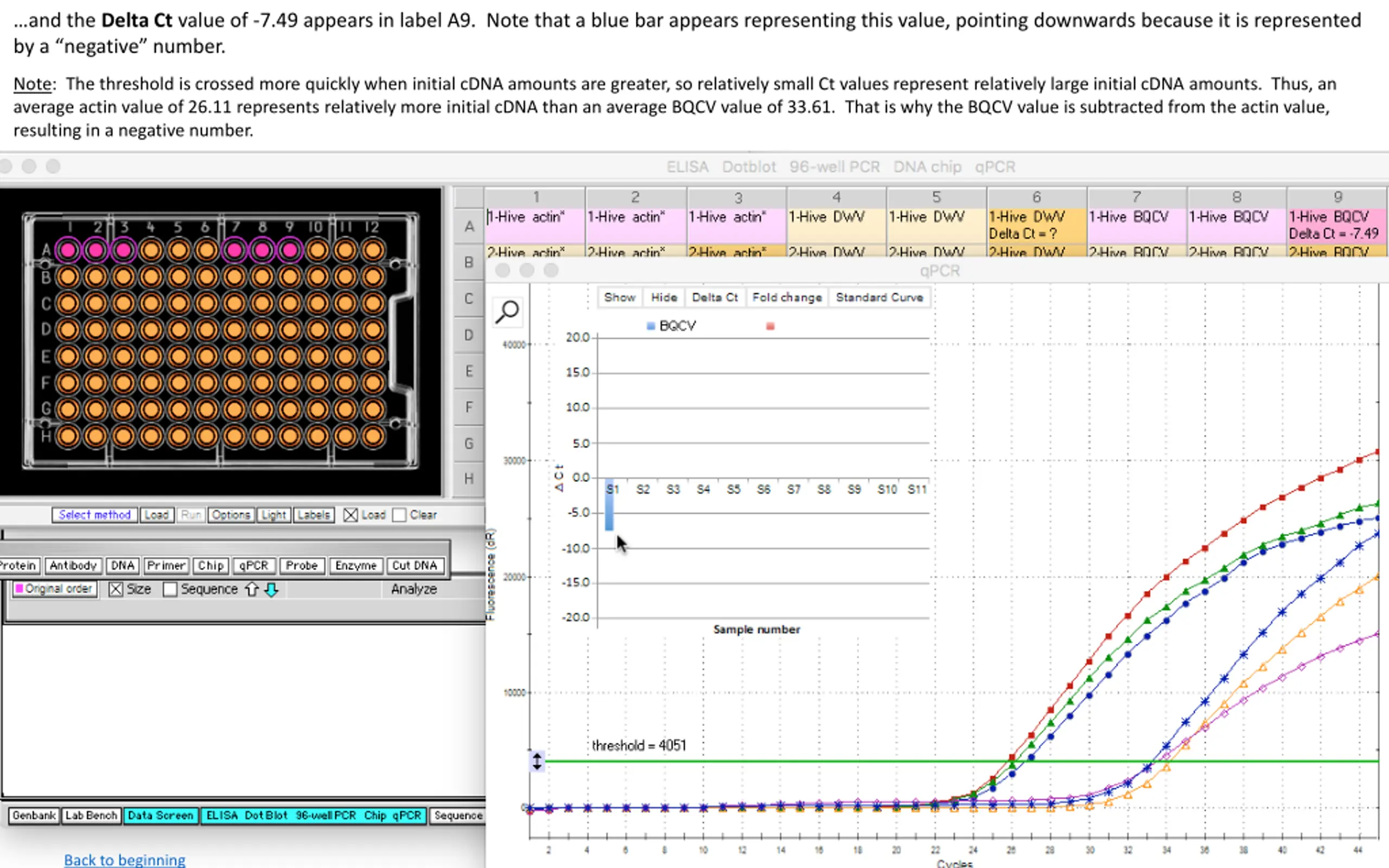 and the Delta Ct value of -7.49 appears in label A9. Note that a blue bar appears representing this value, pointing downwards because it is represented by a negative number. Note: The threshold is crossed more quickly when initial cDNA amounts are greater, so relatively small Ct values represent relatively large initial cDNA amounts. Thus, an average actin value of 26.11 represents relatively more initial cDNA than an average BQCV value of 33.61. That is why the BQCV value is subtracted from the actin value, resulting in a negative number. Back to beginning