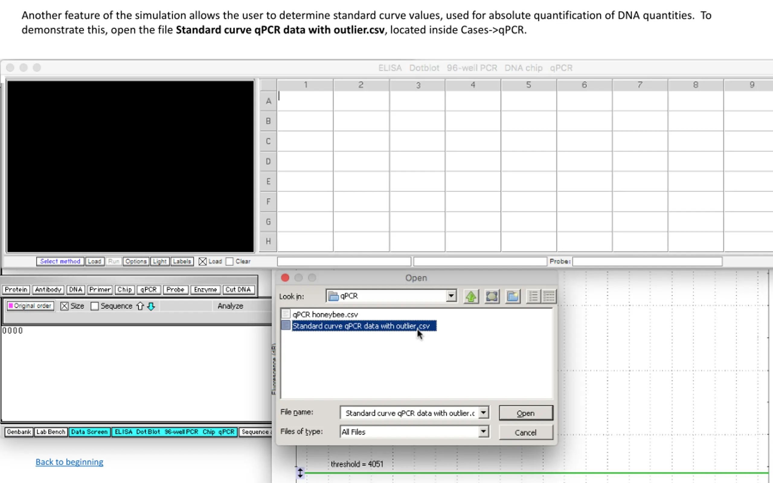 Another feature of the simulation allows the user to determine standard curve values, used for absolute quantification of DNA quantities. To demonstrate this, open the file Standard curve qPCR data with outlier.csv, located inside Cases->qPCR. Back to beginning