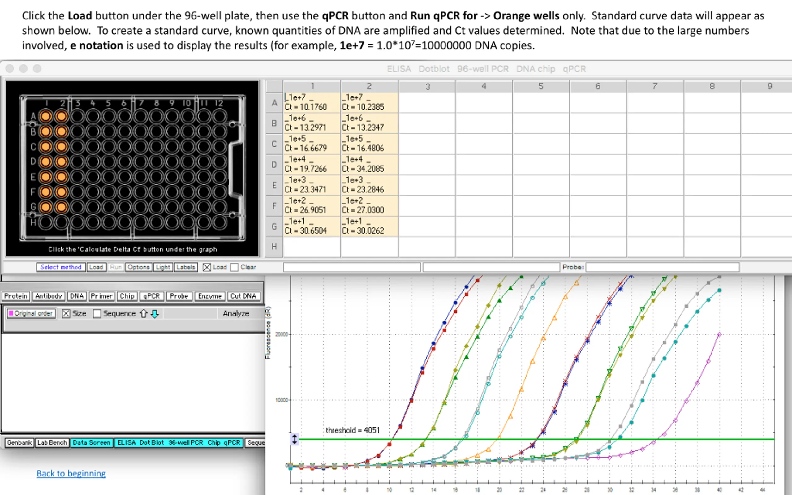 Click the Load button under the 96-well plate, then use the qPCR button and Run qPCR for -> Orange wells only. Standard curve data will appear as shown below. To create a standard curve, known quantities of DNA are amplified and Ct values determined. Note that due to the large numbers involved, e notation is used to display the results (for example, 1e+7 = 1.0*107=10000000 DNA copies. Back to beginning
