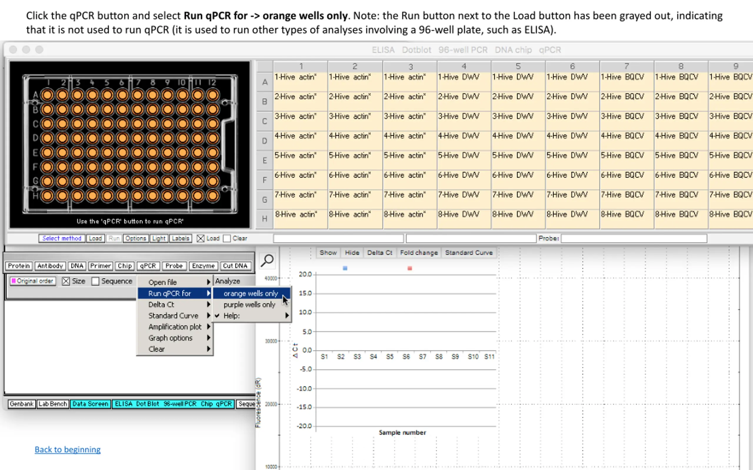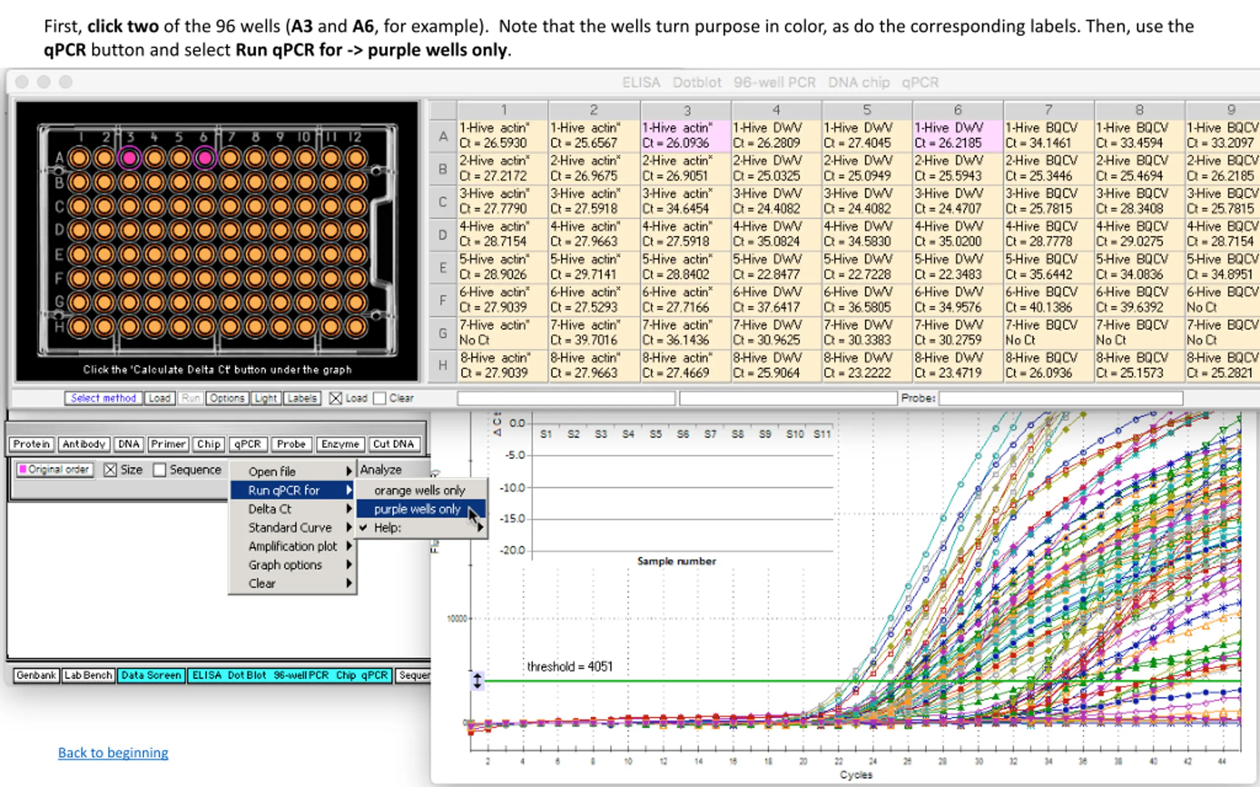 First, click two of the 96 wells (A3 and A6, for example). Note that the wells turn purpose in color, as do the corresponding labels. Then, use the qPCR button and select Run qPCR for -> purple wells only. Back to beginning
