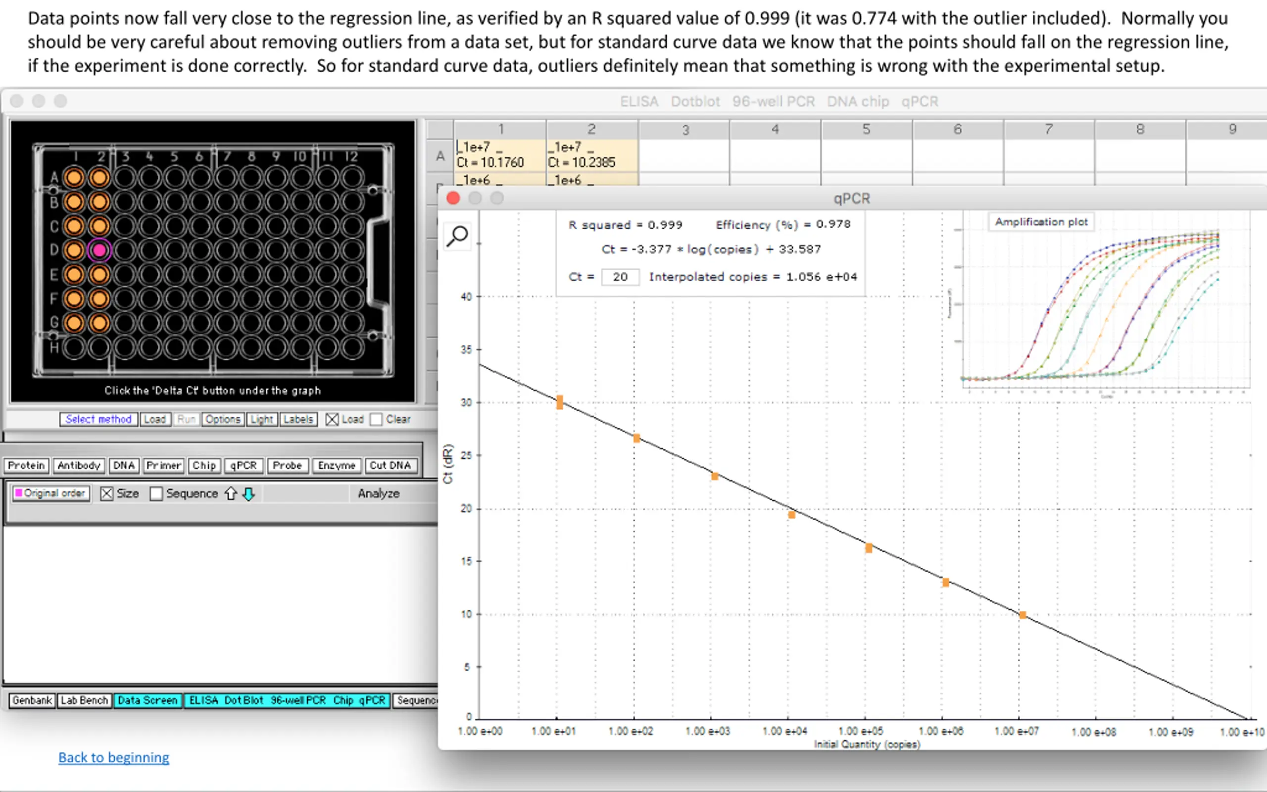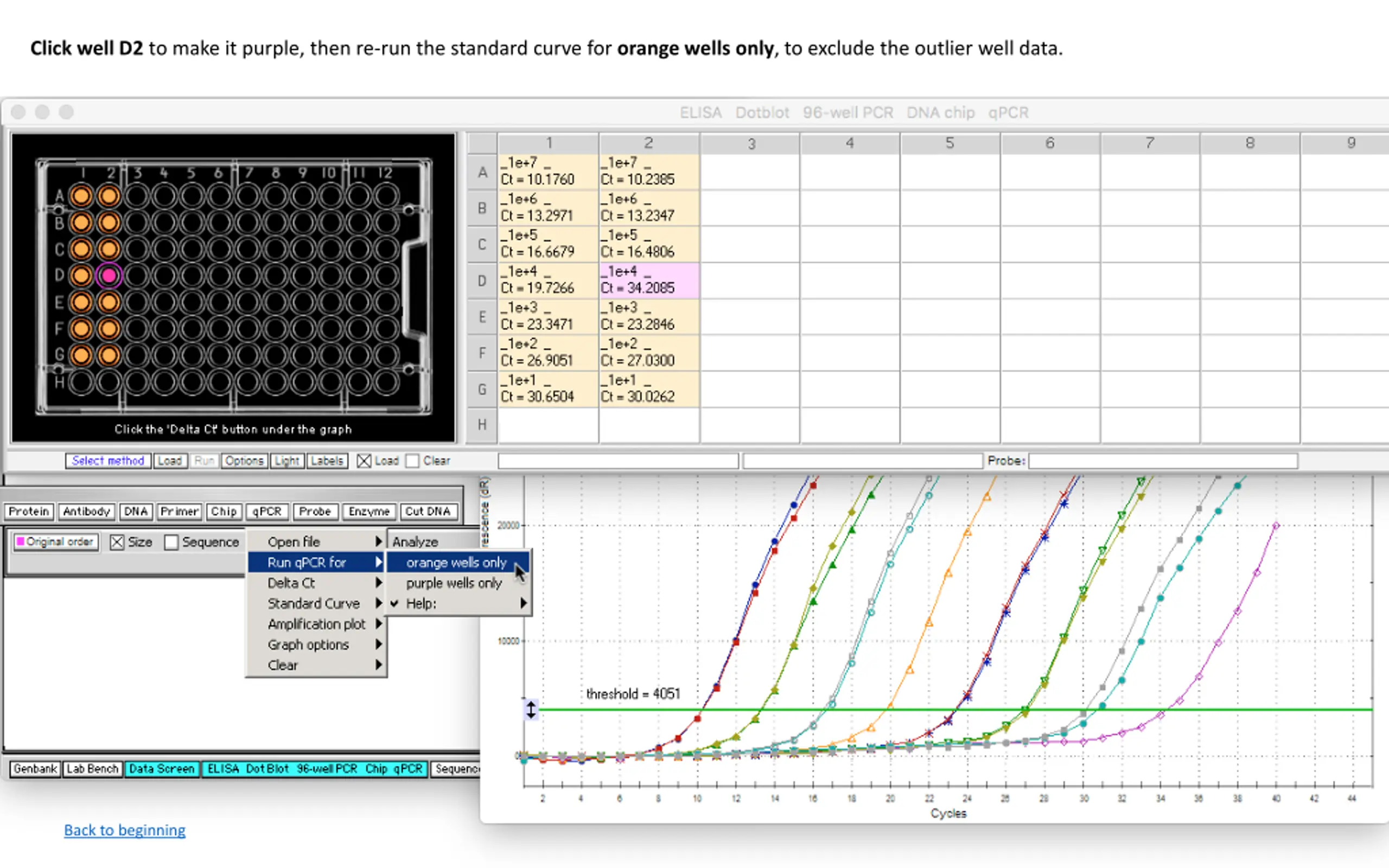 Click well D2 to make it purple, then re-run the standard curve for orange wells only, to exclude the outlier well data. Back to beginning