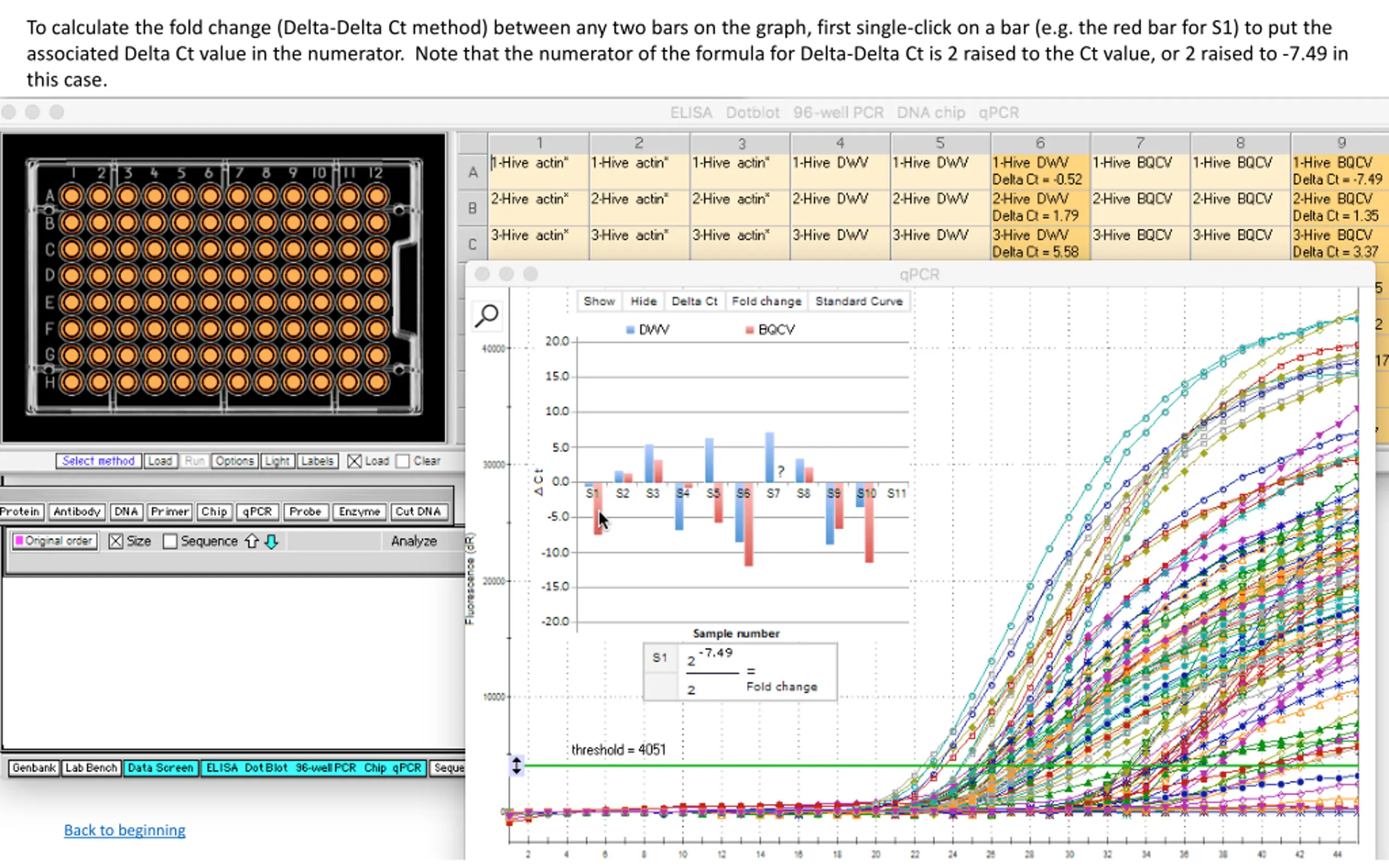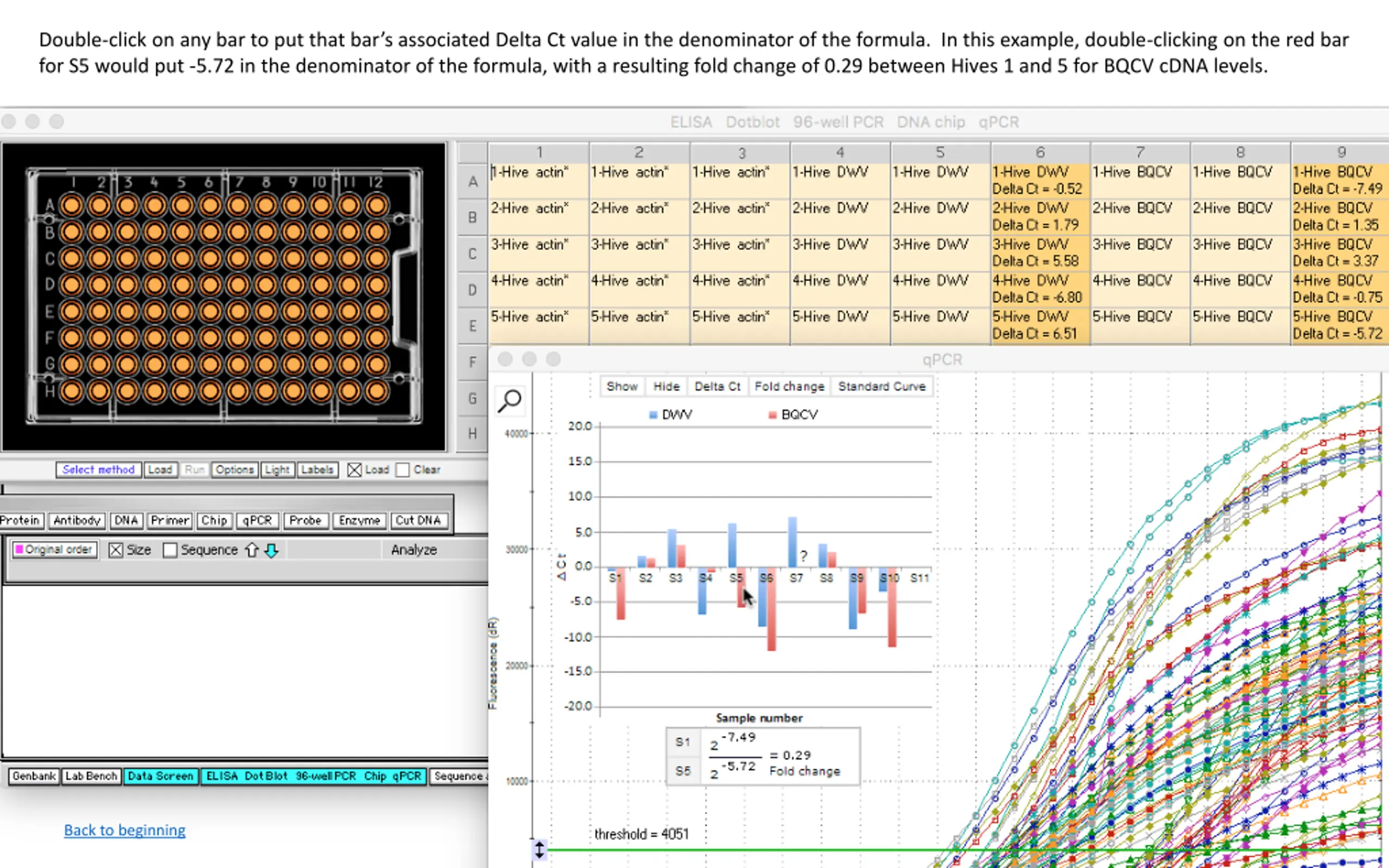 Double-click on any bar to put that bars associated Delta Ct value in the denominator of the formula. In this example, double-clicking on the red bar for S5 would put -5.72 in the denominator of the formula, with a resulting fold change of 0.29 between Hives 1 and 5 for BQCV cDNA levels. Back to beginning
