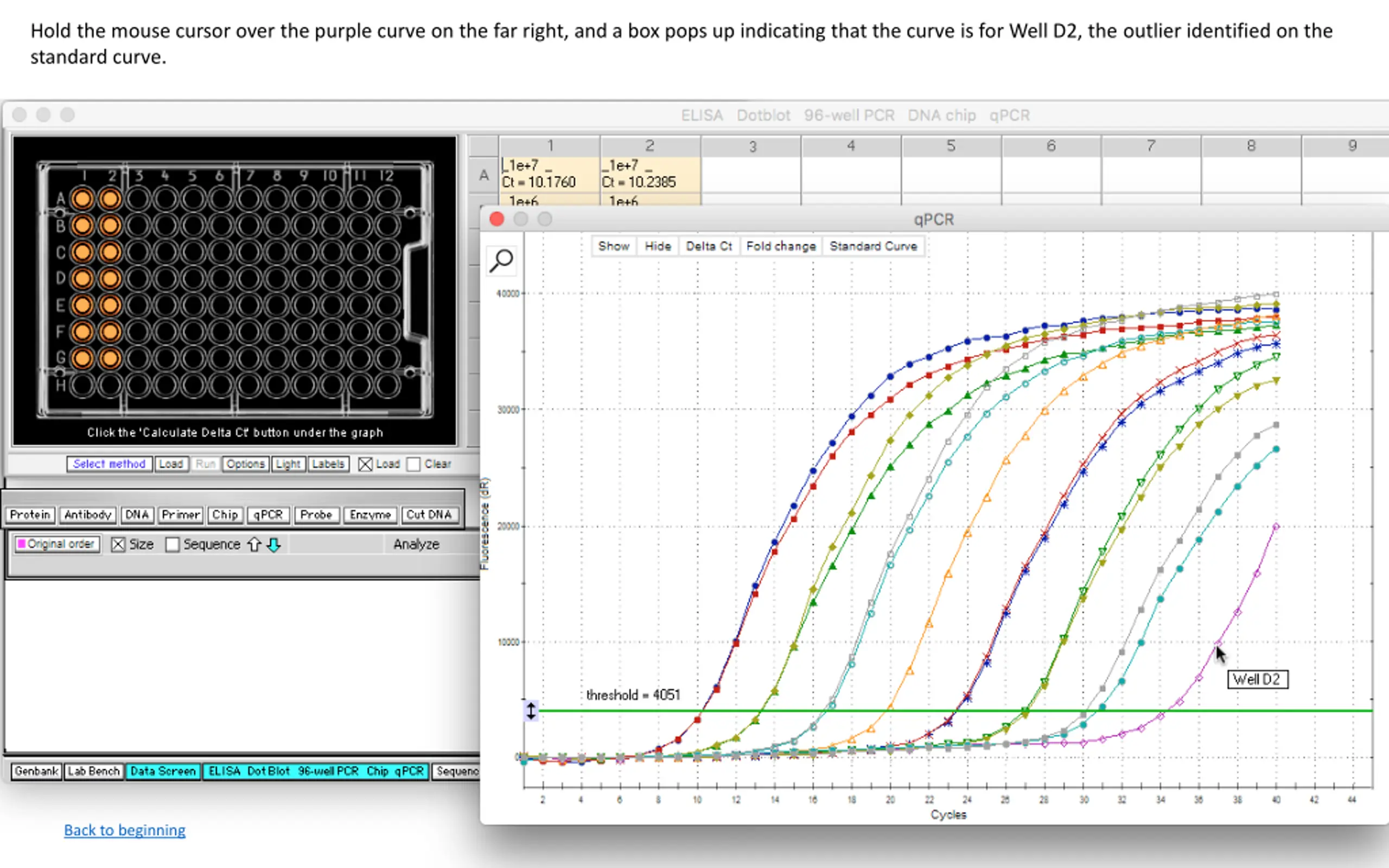 Hold the mouse cursor over the purple curve on the far right, and a box pops up indicating that the curve is for Well D2, the outlier identified on the standard curve. Back to beginning