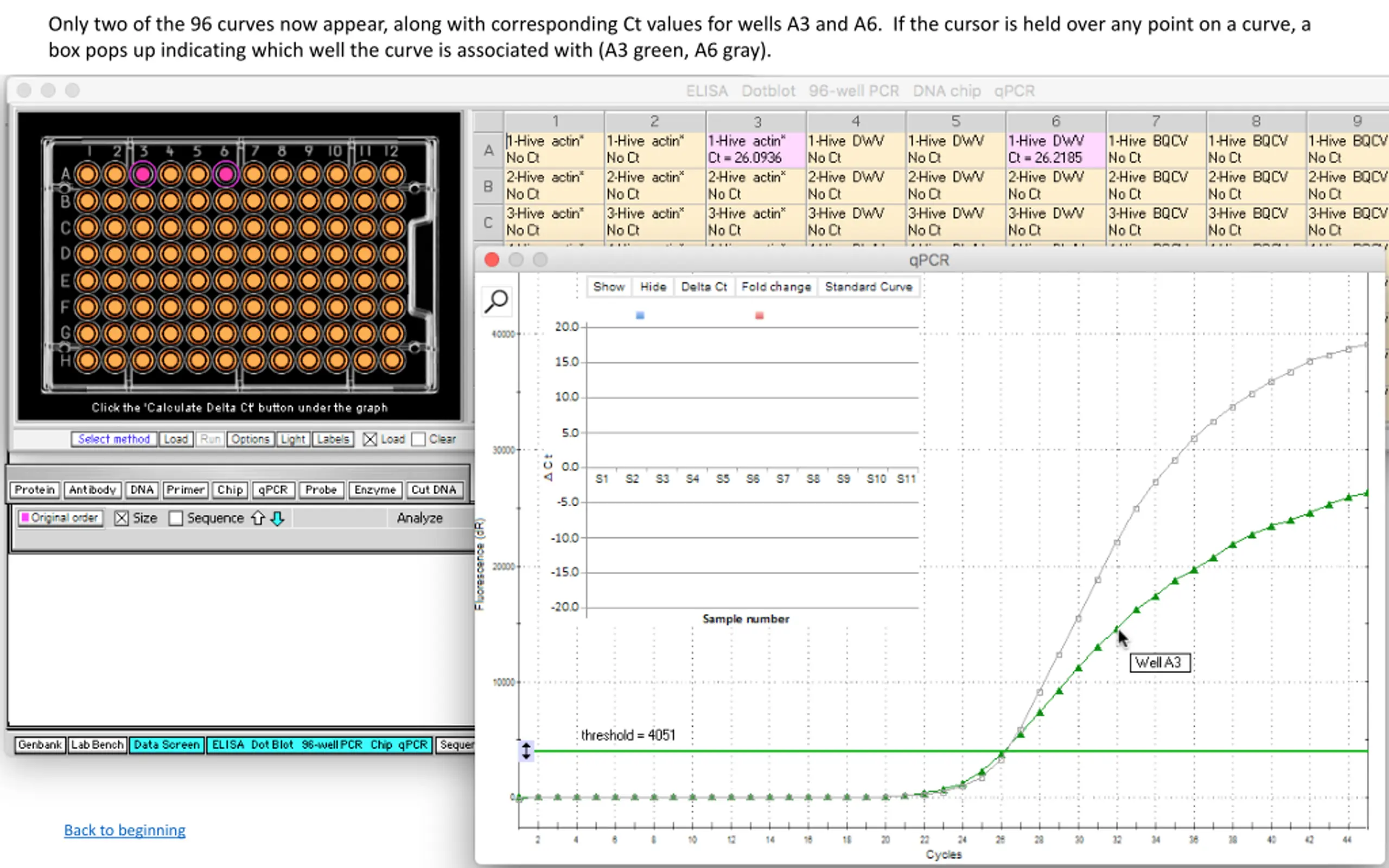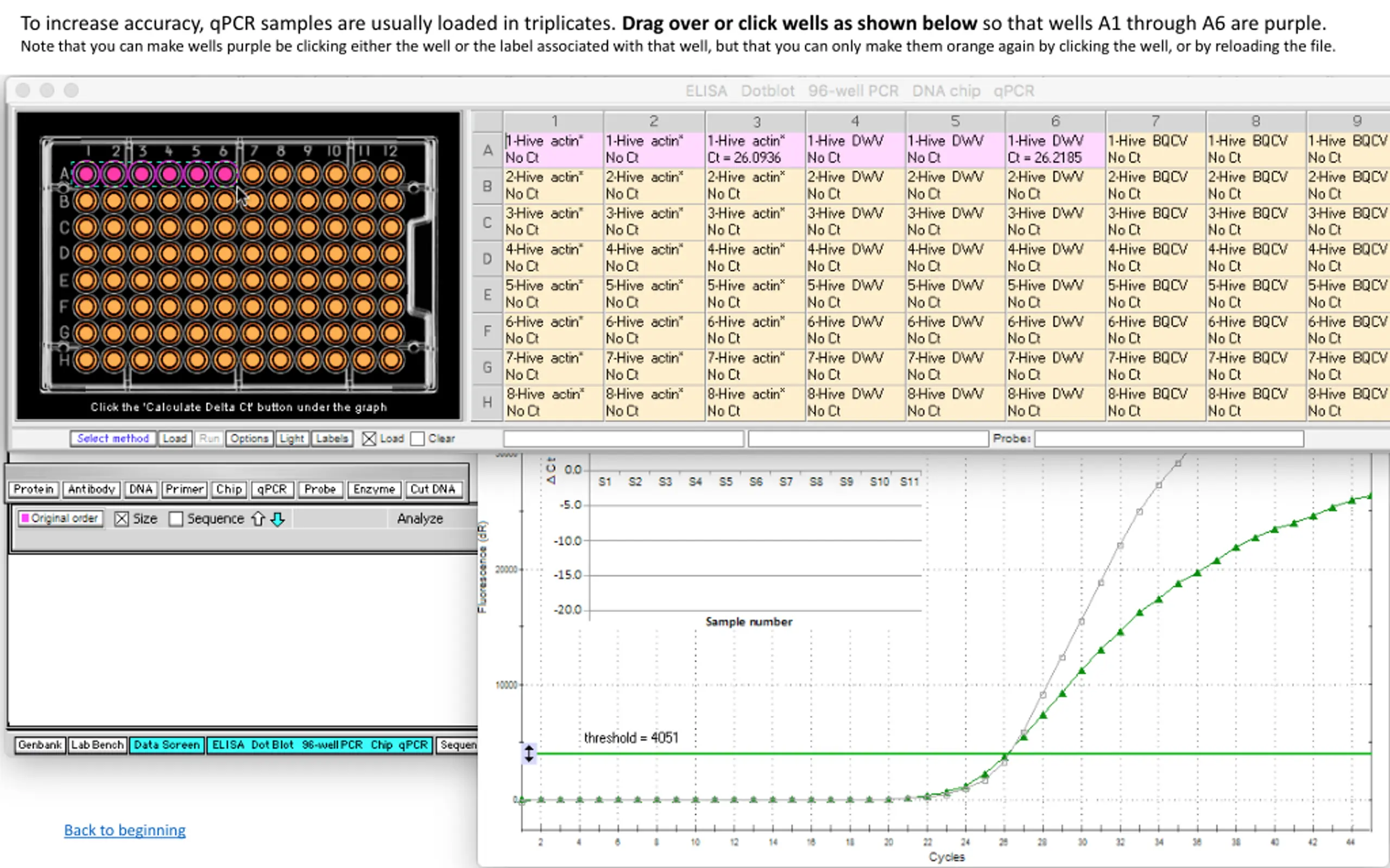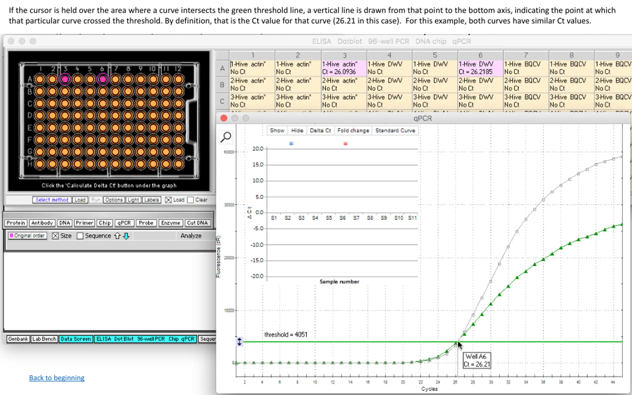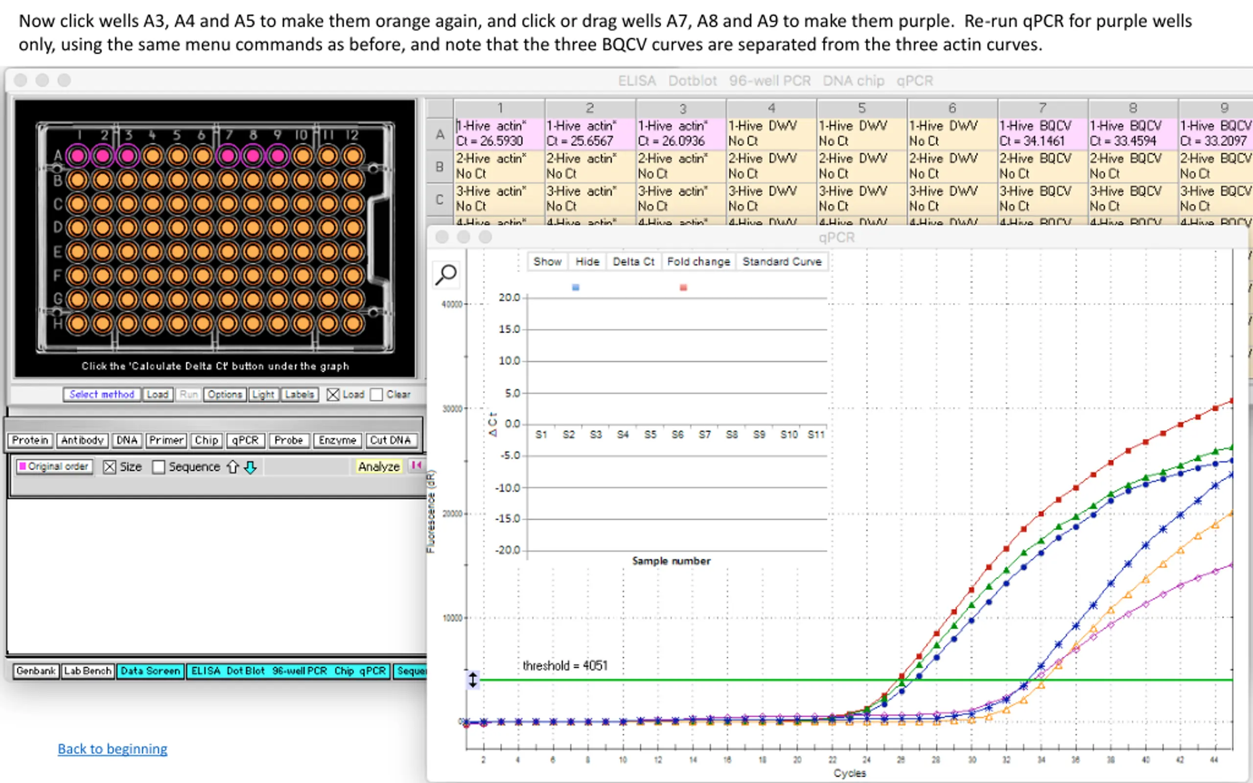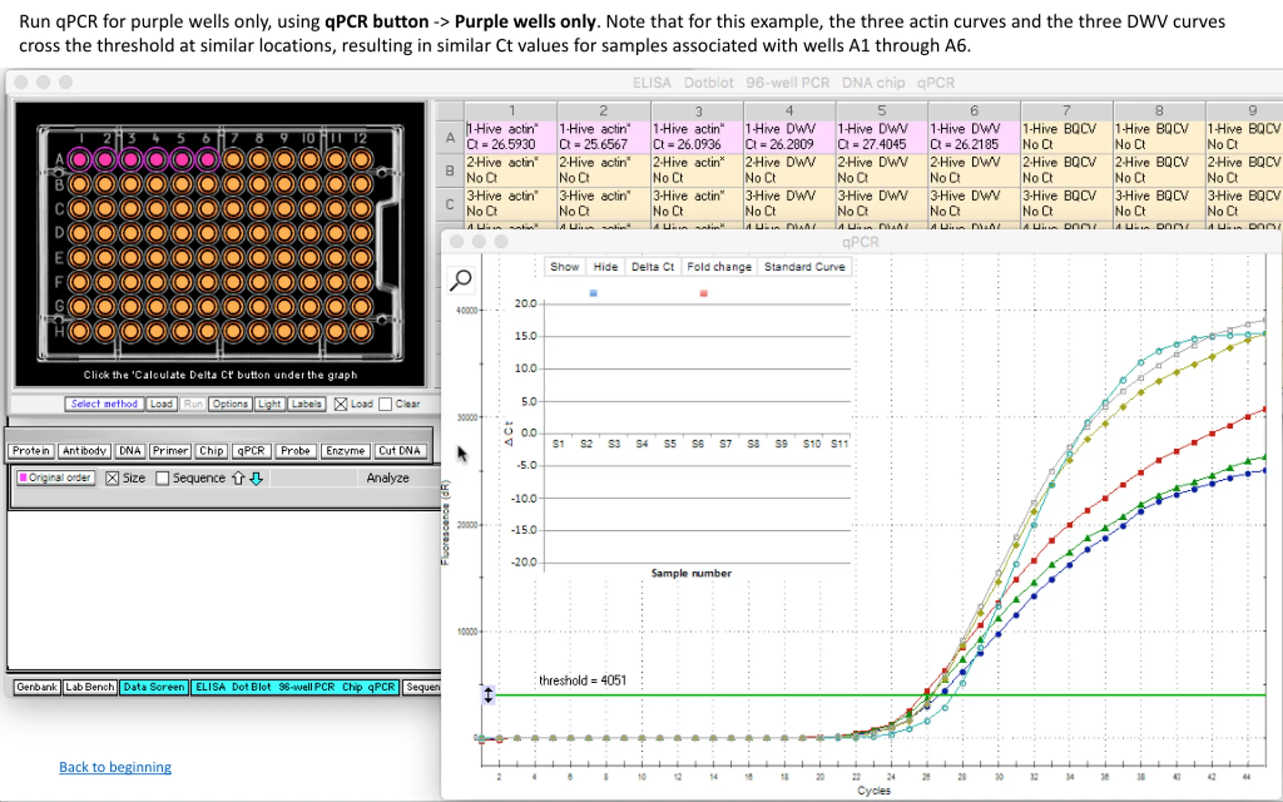 Run qPCR for purple wells only, using qPCR button -> Purple wells only. Note that for this example, the three actin curves and the three DWV curves cross the threshold at similar locations, resulting in similar Ct values for samples associated with wells A1 through A6. Back to beginning