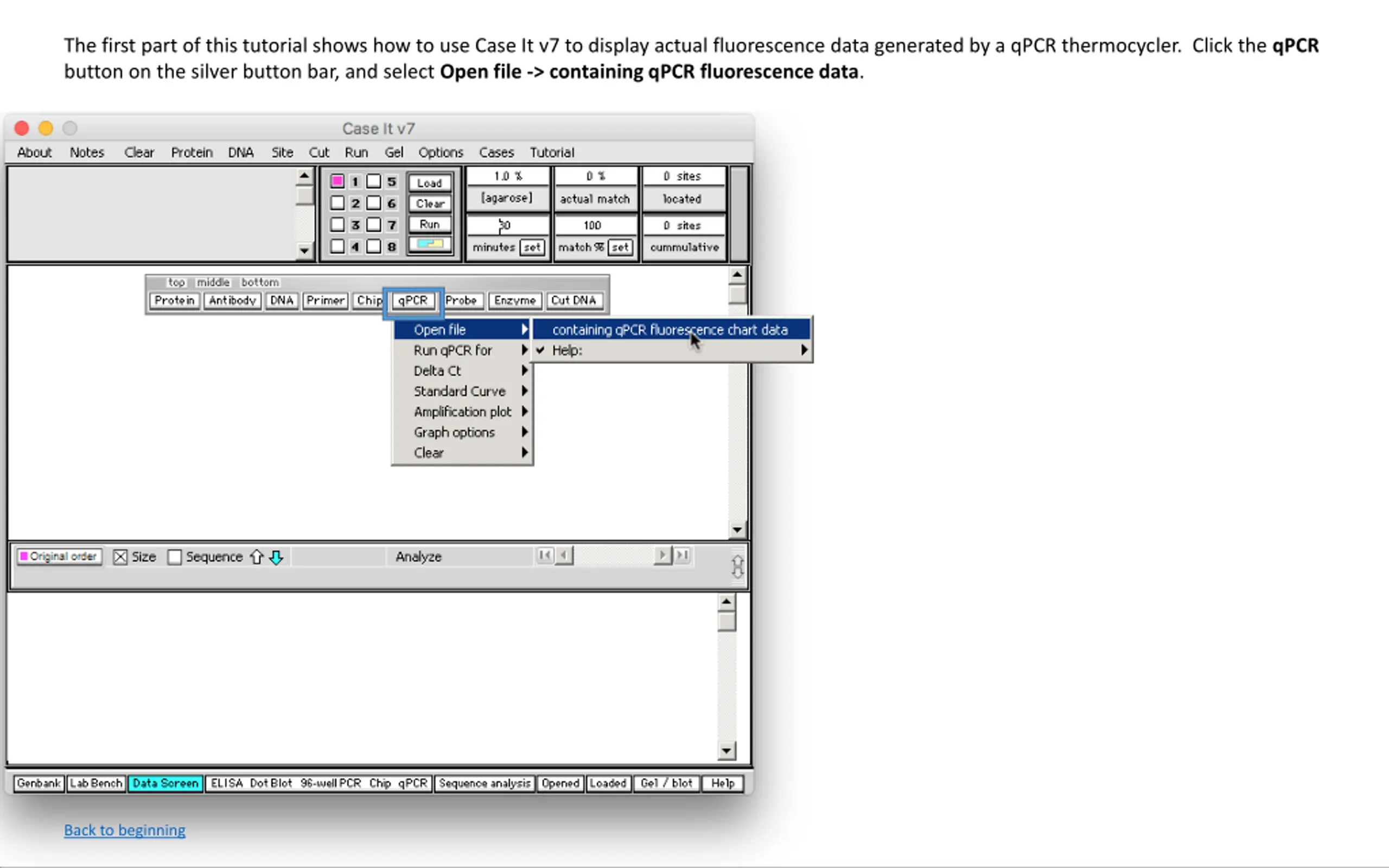 The first part of this tutorial shows how to use Case It v7 to display actual fluorescence data generated by a qPCR thermocycler. Click the qPCR button on the silver button bar, and select Open file -> containing qPCR fluorescence data. Back to beginning
