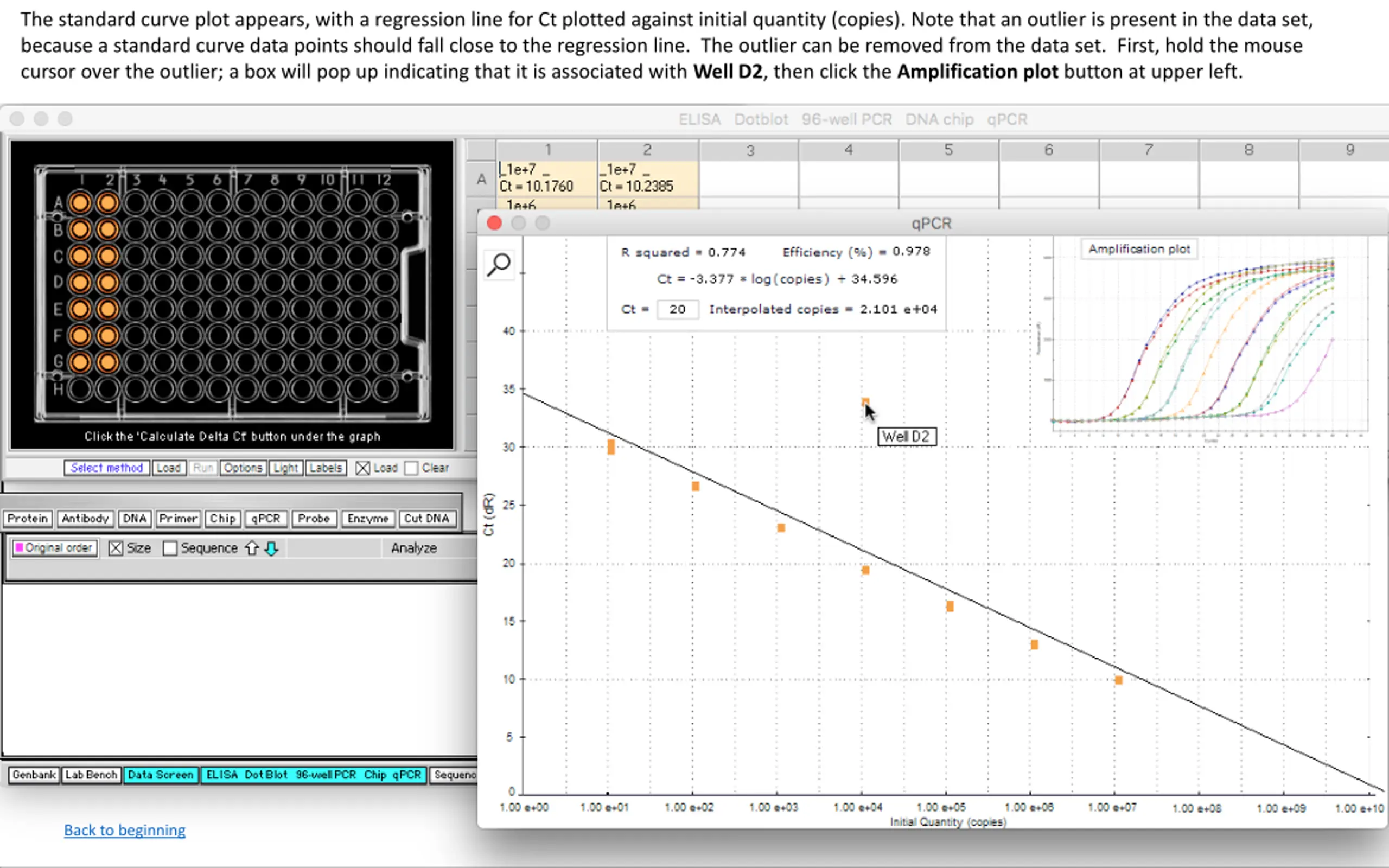 The standard curve plot appears, with a regression line for Ct plotted against initial quantity (copies). Note that an outlier is present in the data set, because a standard curve data points should fall close to the regression line. The outlier can be removed from the data set. First, hold the mouse cursor over the outlier; a box will pop up indicating that it is associated with Well D2, then click the Amplification plot button at upper left. Back to beginning