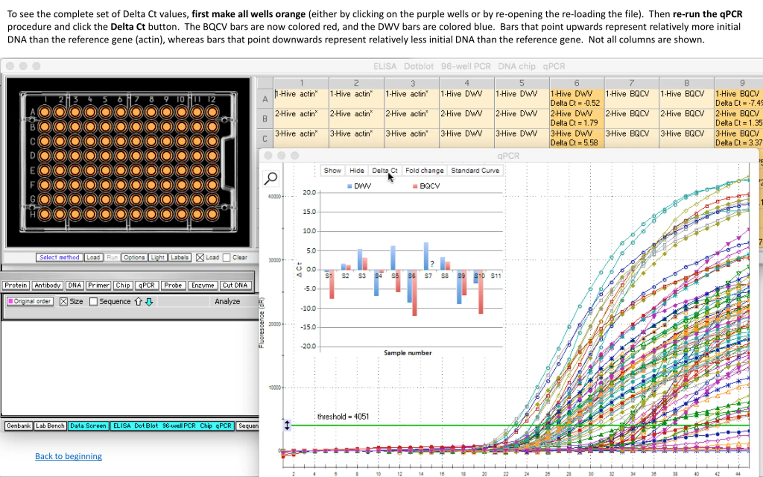 To see the complete set of Delta Ct values, firstmake all wells orange (either by clicking on the purple wells or by re-opening the re-loading the file). Then re-run the qPCR procedure and click the Delta Ct button. The BQCV bars are now colored red, and the DWV bars are colored blue. Bars that point upwards represent relatively more initial DNA than the reference gene (actin), whereas bars that point downwards represent relatively less initial DNA than the reference gene. Not all columns are shown. Back to beginning