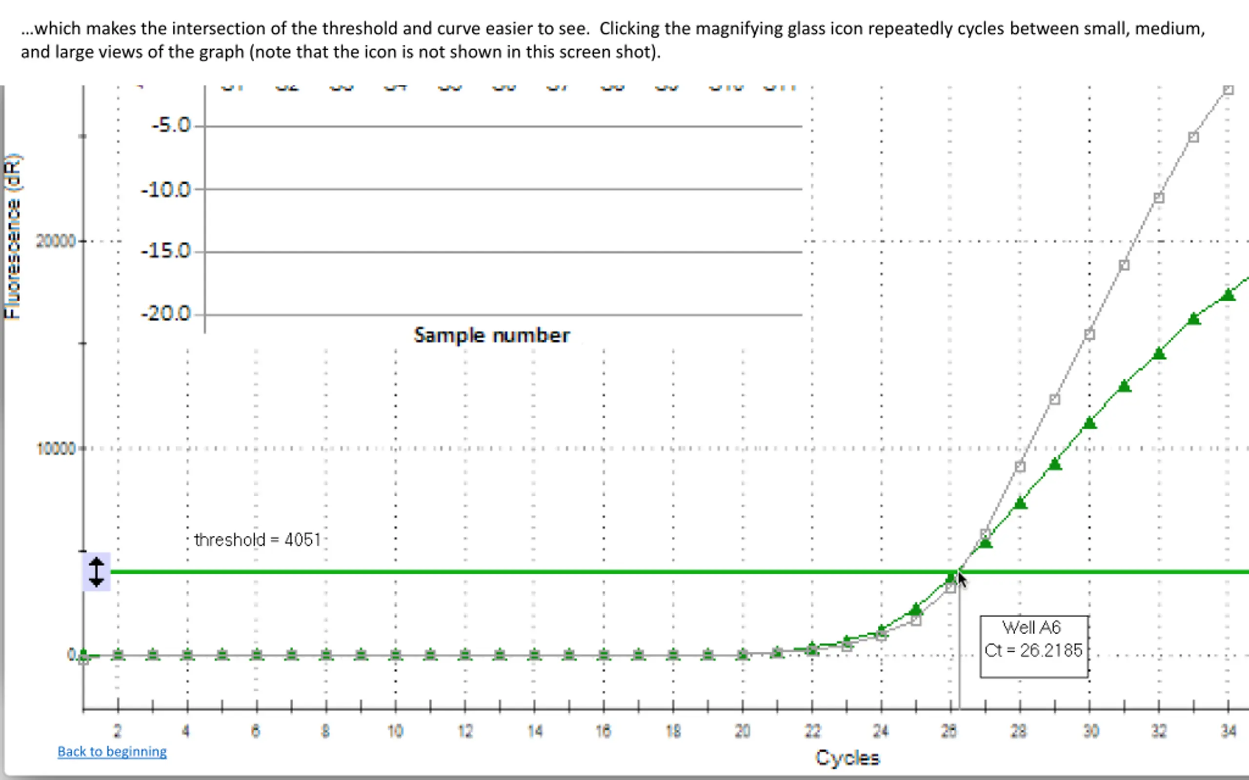 Only two of the 96 curves now appear, along with corresponding Ct values for wells A3 and A6. If the cursor is held over any point on a curve, a box pops up indicating which well the curve is associated with (A3 green, A6 gray). Back to beginning