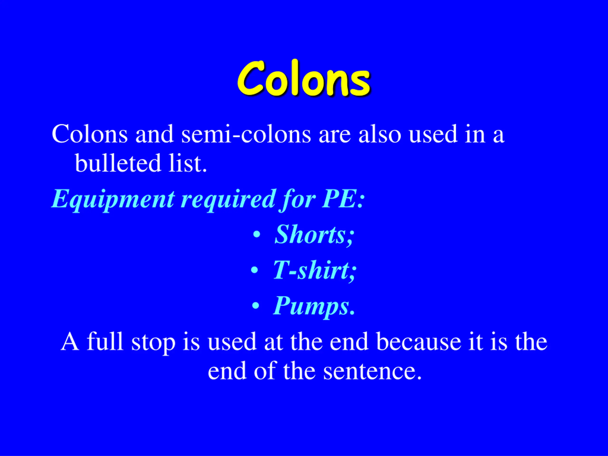 Colons Colons and semi-colons are also used in a bulleted list. Equipment required for PE: Shorts; T-shirt; Pumps. A full stop is used at the end because it is the end of the sentence.