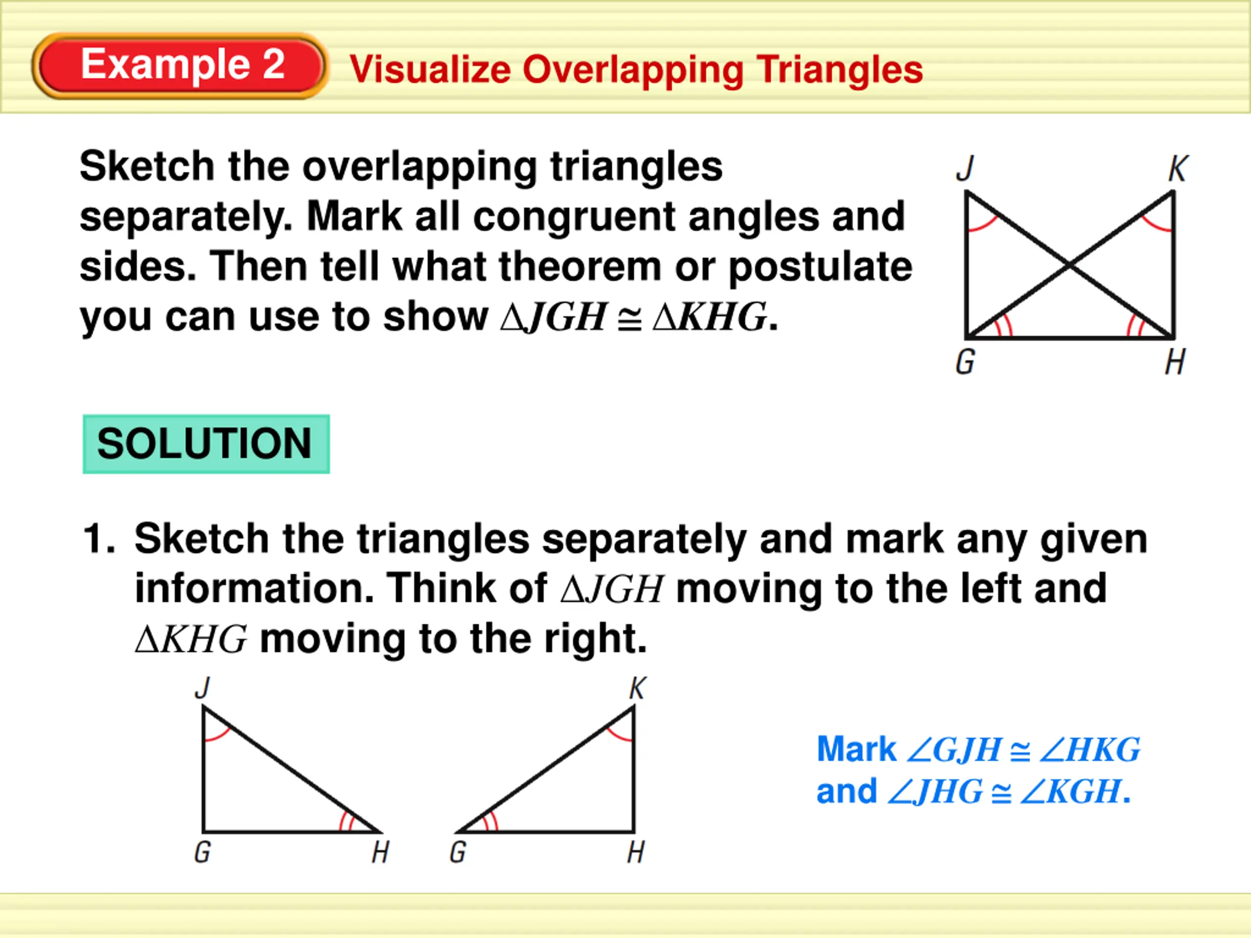Example 2 Visualize Overlapping Triangles Sketch the overlapping triangles separately. Mark all congruent angles and sides. Then tell what theorem or postulate you can use to show JGH KHG. SOLUTION 1. Sketch the triangles separately and mark any given information. Think of JGHmoving to the left and KHGmoving to the right. Mark GJH HKG and JHG KGH.