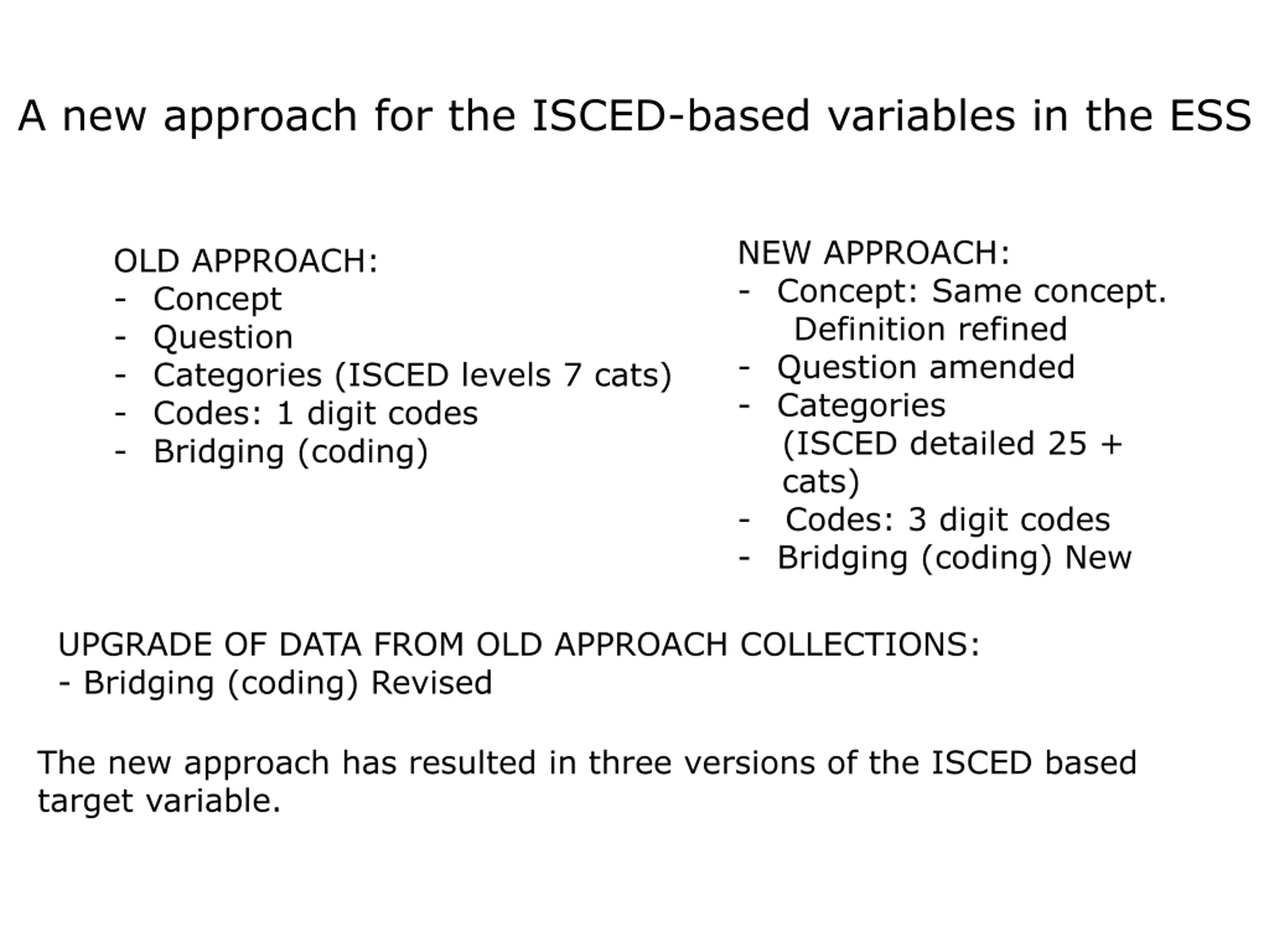 A new approach for the ISCED-based variables in the ESS NEW APPROACH: - Concept: Same concept. Definition refined - Question amended - Categories (ISCED detailed 25 + cats) - Codes: 3 digit codes - Bridging (coding) New OLD APPROACH: - Concept - Question - Categories (ISCED levels 7 cats) - Codes: 1 digit codes - Bridging (coding) UPGRADE OF DATA FROM OLD APPROACH COLLECTIONS: - Bridging (coding) Revised The new approach has resulted in three versions of the ISCED based target variable.