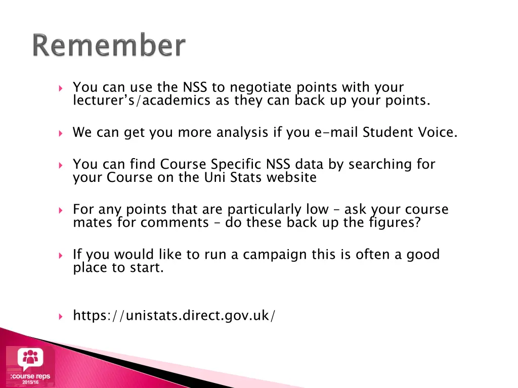 You can use the NSS to negotiate points with your lecturer s/academics as they can back up your points. We can get you more analysis if you e-mail Student Voice. You can find Course Specific NSS data by searching for your Course on the Uni Stats website For any points that are particularly low ask your course mates for comments do these back up the figures? If you would like to run a campaign this is often a good place to start. https://unistats.direct.gov.uk/