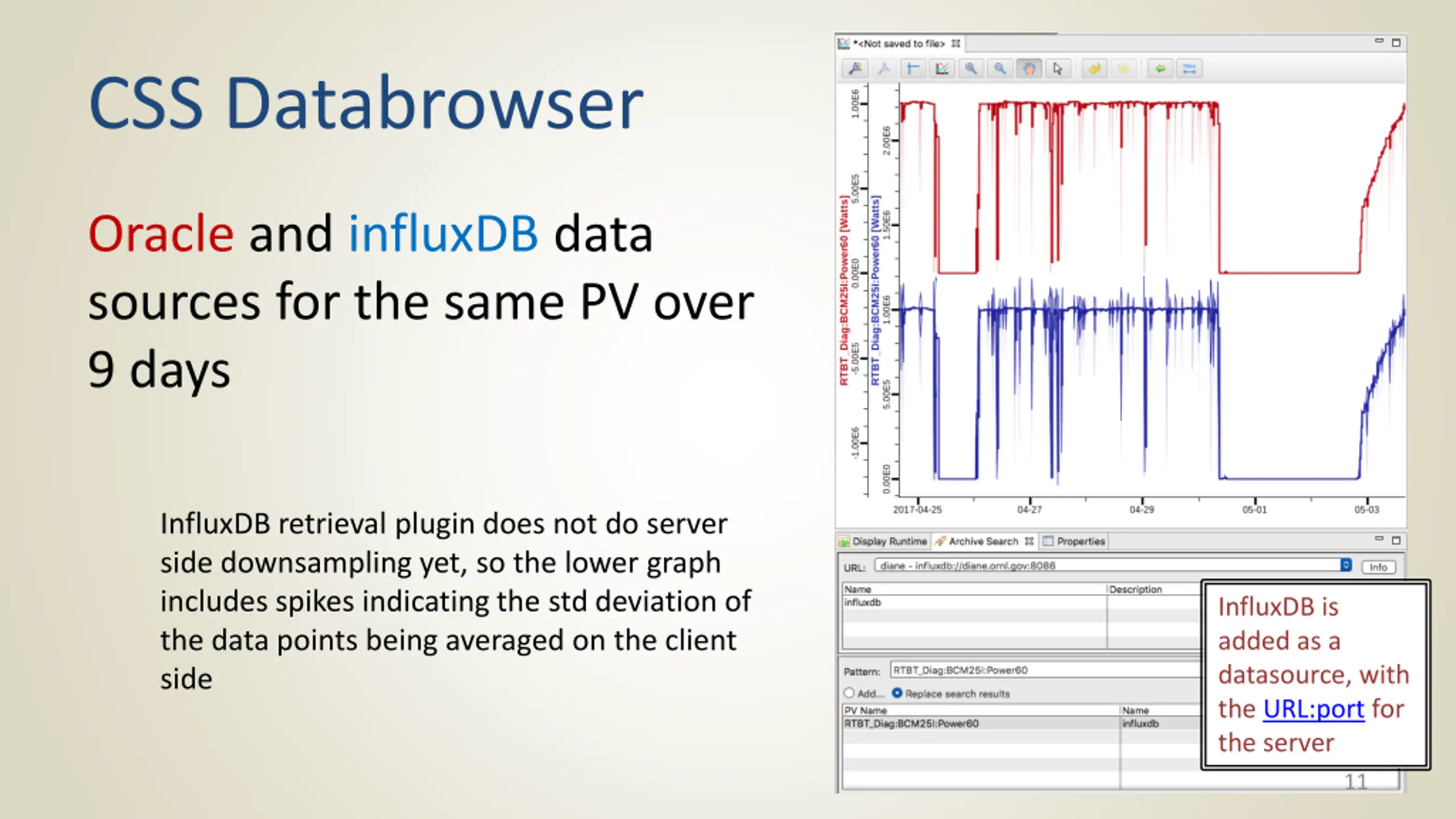 CSS Databrowser Oracle and influxDB data sources for the same PV over 9 days InfluxDB retrieval plugin does not do server side downsampling yet, so the lower graph includes spikes indicating the std deviation of the data points being averaged on the client side InfluxDB is added as a datasource, with the URL:port for the server 11