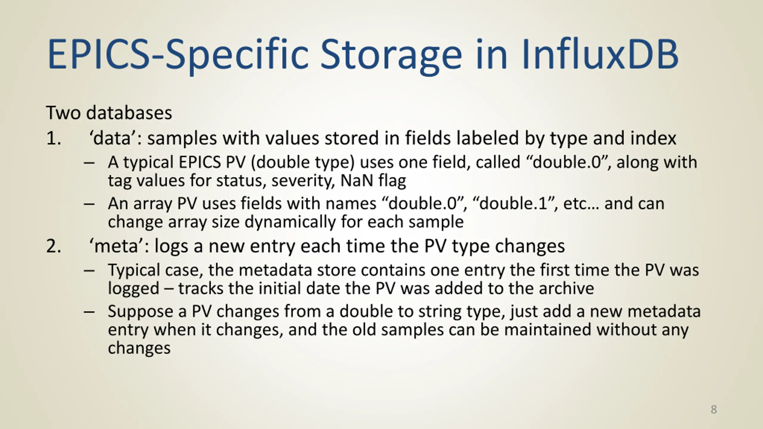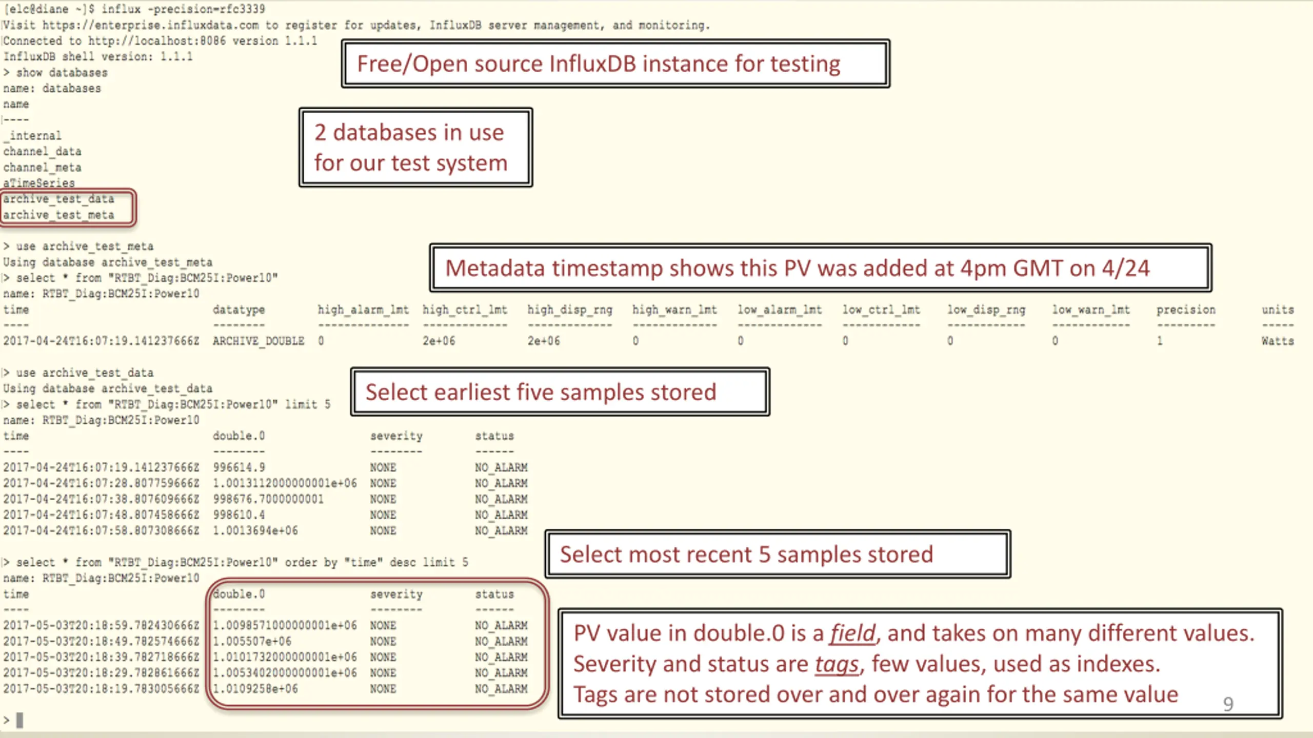 EPICS-Specific Storage in InfluxDB Two databases 1. data : samples with values stored in fields labeled by type and index A typical EPICS PV (double type) uses one field, called double.0 , along with tag values for status, severity, NaN flag An array PV uses fields with names double.0 , double.1 , etc and can change array size dynamically for each sample 2. meta : logs a new entry each time the PV type changes Typical case, the metadata store contains one entry the first time the PV was logged tracks the initial date the PV was added to the archive Suppose a PV changes from a double to string type, just add a new metadata entry when it changes, and the old samples can be maintained without any changes 8