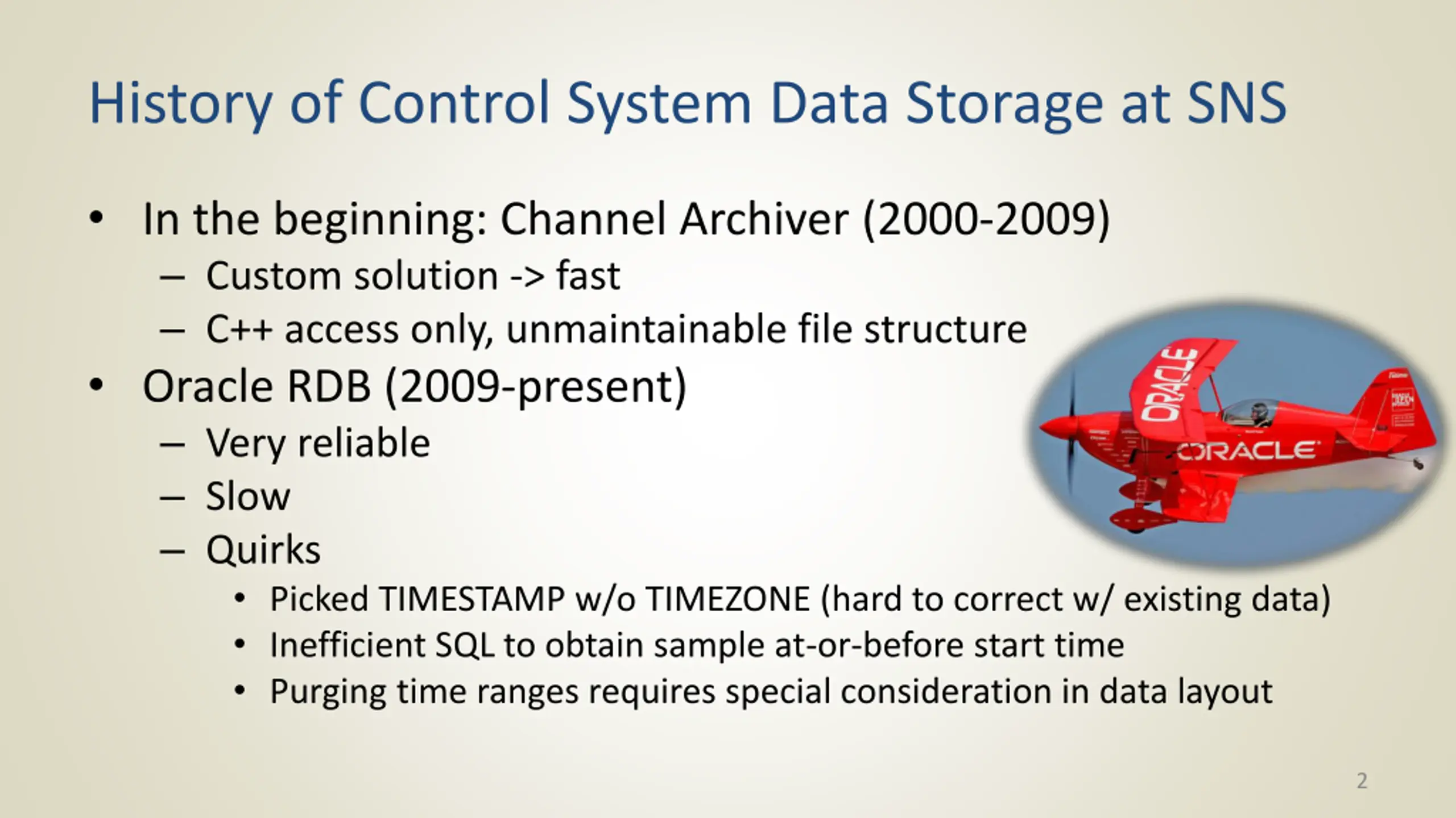 History of Control System Data Storage at SNS In the beginning: Channel Archiver (2000-2009) Custom solution -> fast C++ access only, unmaintainable file structure Oracle RDB (2009-present) Very reliable Slow Quirks Picked TIMESTAMP w/o TIMEZONE (hard to correct w/ existing data) Inefficient SQL to obtain sample at-or-before start time Purging time ranges requires special consideration in data layout 2