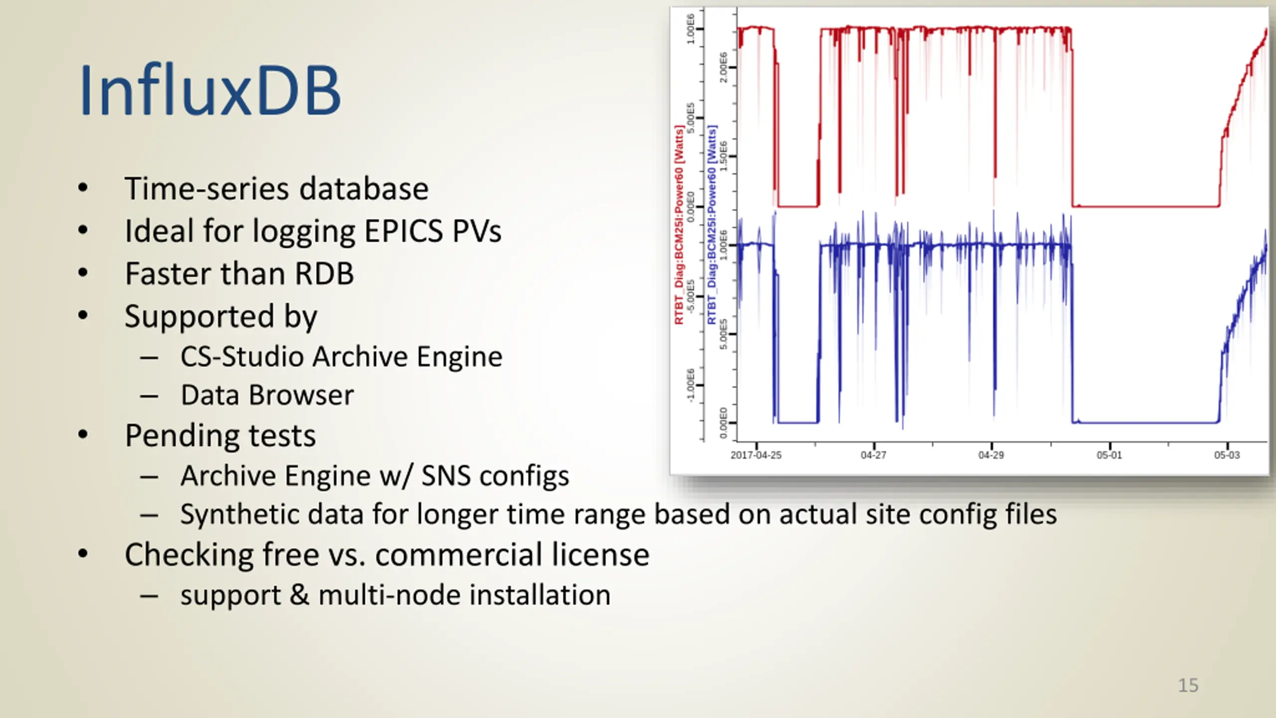 InfluxDB Time-series database Ideal for logging EPICS PVs Faster than RDB Supported by CS-Studio Archive Engine Data Browser Pending tests Archive Engine w/ SNS configs Synthetic data for longer time range based on actual site config files Checking free vs. commercial license support & multi-node installation 15