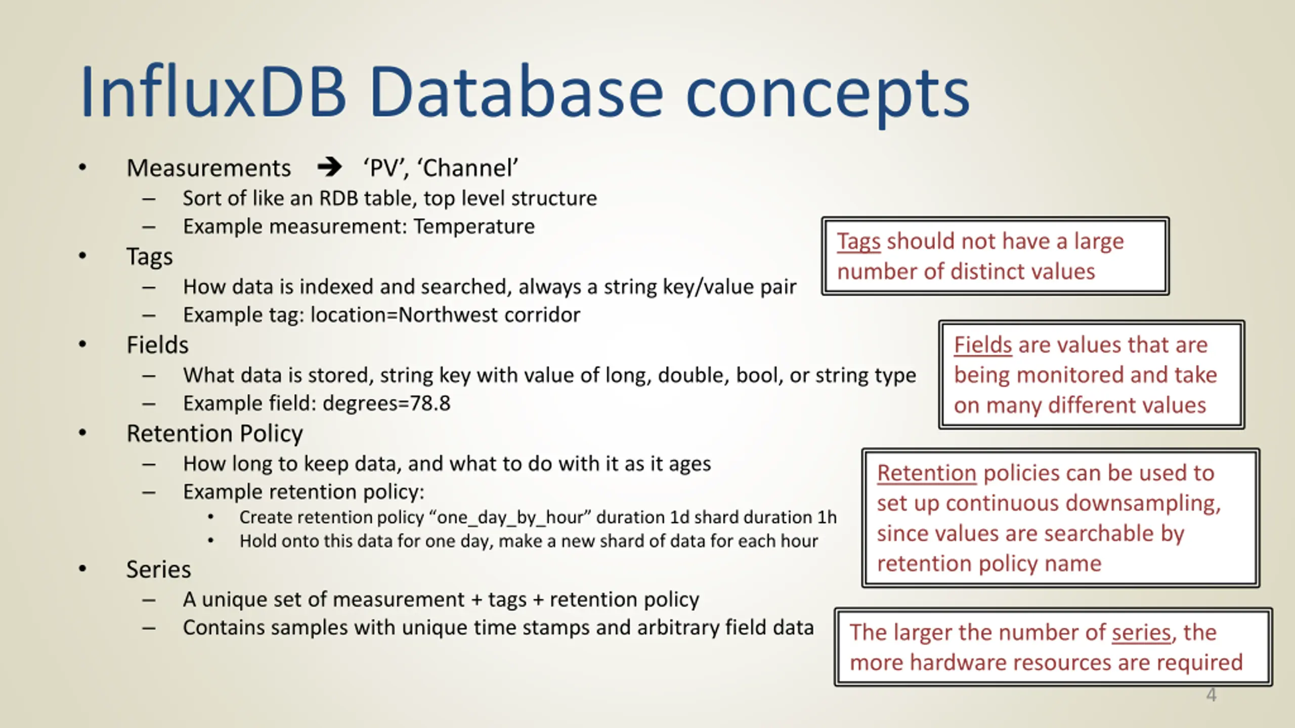 "EPICS Channel History Storage Requirements, history of control system data storage at SNS, overview of InfluxDB database concepts including measurements, tags, fields, and retention policy for efficient time series data storage and retrieval."
