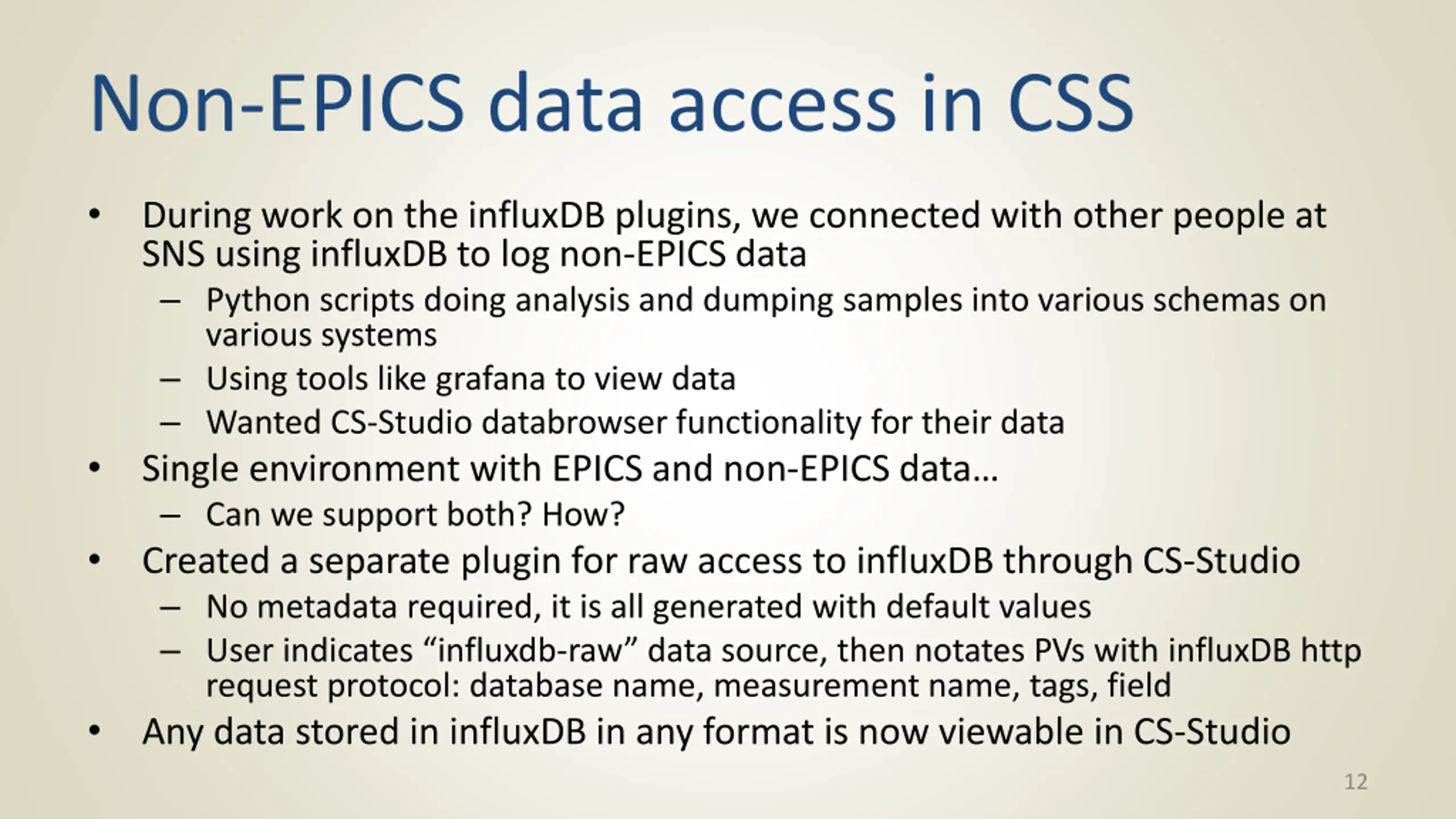 Non-EPICS data access in CSS During work on the influxDB plugins, we connected with other people at SNS using influxDB to log non-EPICS data Python scripts doing analysis and dumping samples into various schemas on various systems Using tools like grafana to view data Wanted CS-Studio databrowser functionality for their data Single environment with EPICS and non-EPICS data Can we support both? How? Created a separate plugin for raw access to influxDB through CS-Studio No metadata required, it is all generated with default values User indicates influxdb-raw data source, then notates PVs with influxDB http request protocol: database name, measurement name, tags, field Any data stored in influxDB in any format is now viewable in CS-Studio 12