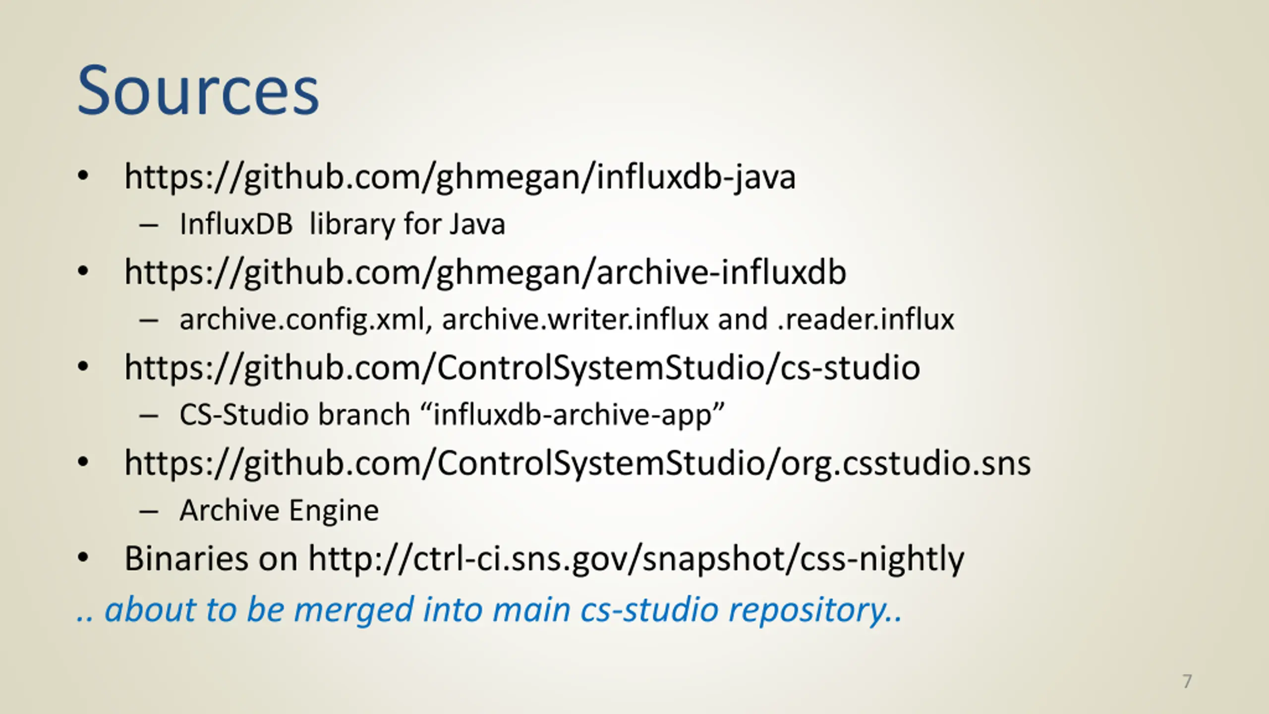 Sources https://github.com/ghmegan/influxdb-java InfluxDB library for Java https://github.com/ghmegan/archive-influxdb archive.config.xml, archive.writer.influx and .reader.influx https://github.com/ControlSystemStudio/cs-studio CS-Studio branch influxdb-archive-app https://github.com/ControlSystemStudio/org.csstudio.sns Archive Engine Binaries on http://ctrl-ci.sns.gov/snapshot/css-nightly .. about to be merged into main cs-studio repository.. 7