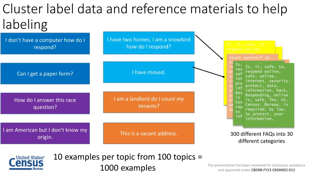Cluster label data and reference materials to help labeling I have two homes, I am a snowbird how do I respond? I don t have a computer how do I respond? Is, it, safe, to, respond online, safe, online, internet, security, protect, data, information, hack, Responding online is safe. The US Census Bureau is required, by law, to protect, your information, address of the place where you address of the place where you required, by law, to protect, your to protect, your Is, it, safe, to, respond online, safe, online, internet, security, protect, data, information, hack, Responding online is safe. The US Census Bureau is required, by law, to protect, your information, were staying on april first 2020 were staying on april first 2020 information, information, count yourself at your usual residence that is where you live and sleep most of the time if you spend equal time at both places use the equal time at both places use the is safe. The US Census Bureau is Census, Bureau, is required, by law, count yourself at your usual residence that is where you live and sleep most of the time if you spend information, hack, Responding online Responding, online is, safe, The, US, Is, it, safe, to, respond online, safe, online, internet, security, protect, data, protect, data, information, hack, Is, it, safe, to, respond online, safe, online, internet, security, I have moved. Can I get a paper form? I am a landlord do I count my tenants? How do I answer this race question? I am American but I don t know my origin. This is a vacant address. 300 different FAQs into 30 different categories 10 examples per topic from 100 topics = 1000 examples The presentation has been reviewed for disclosure avoidance and approved under CBDRB-FY23-CBSM002-012