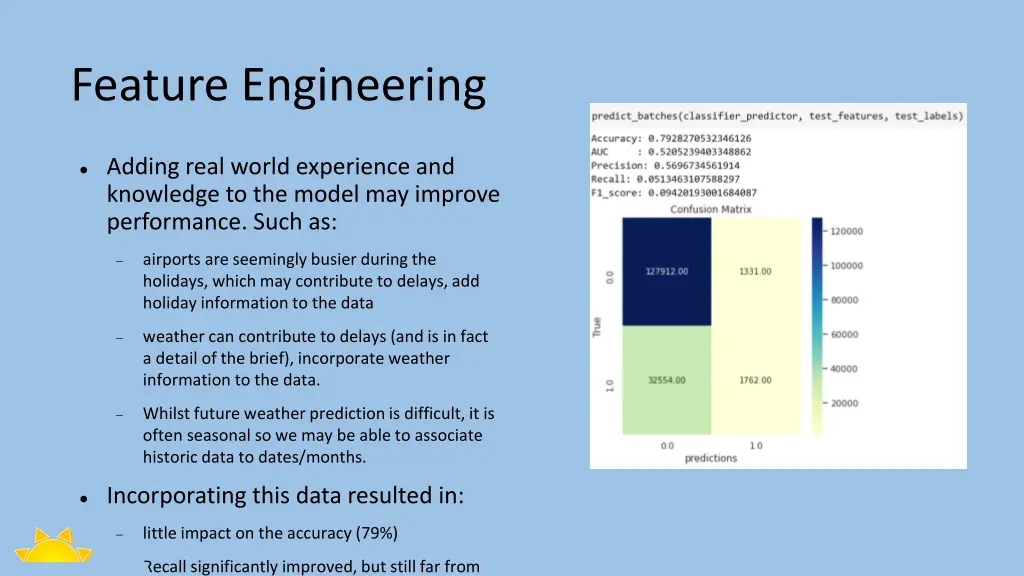 Feature Engineering Adding real world experience and knowledge to the model may improve performance. Such as: airports are seemingly busier during the holidays, which may contribute to delays, add holiday information to the data weather can contribute to delays (and is in fact a detail of the brief), incorporate weather information to the data. Whilst future weather prediction is difficult, it is often seasonal so we may be able to associate historic data to dates/months. Incorporating this data resulted in: little impact on the accuracy (79%) Recall significantly improved, but still far from desirable (0.3% -> 5%)