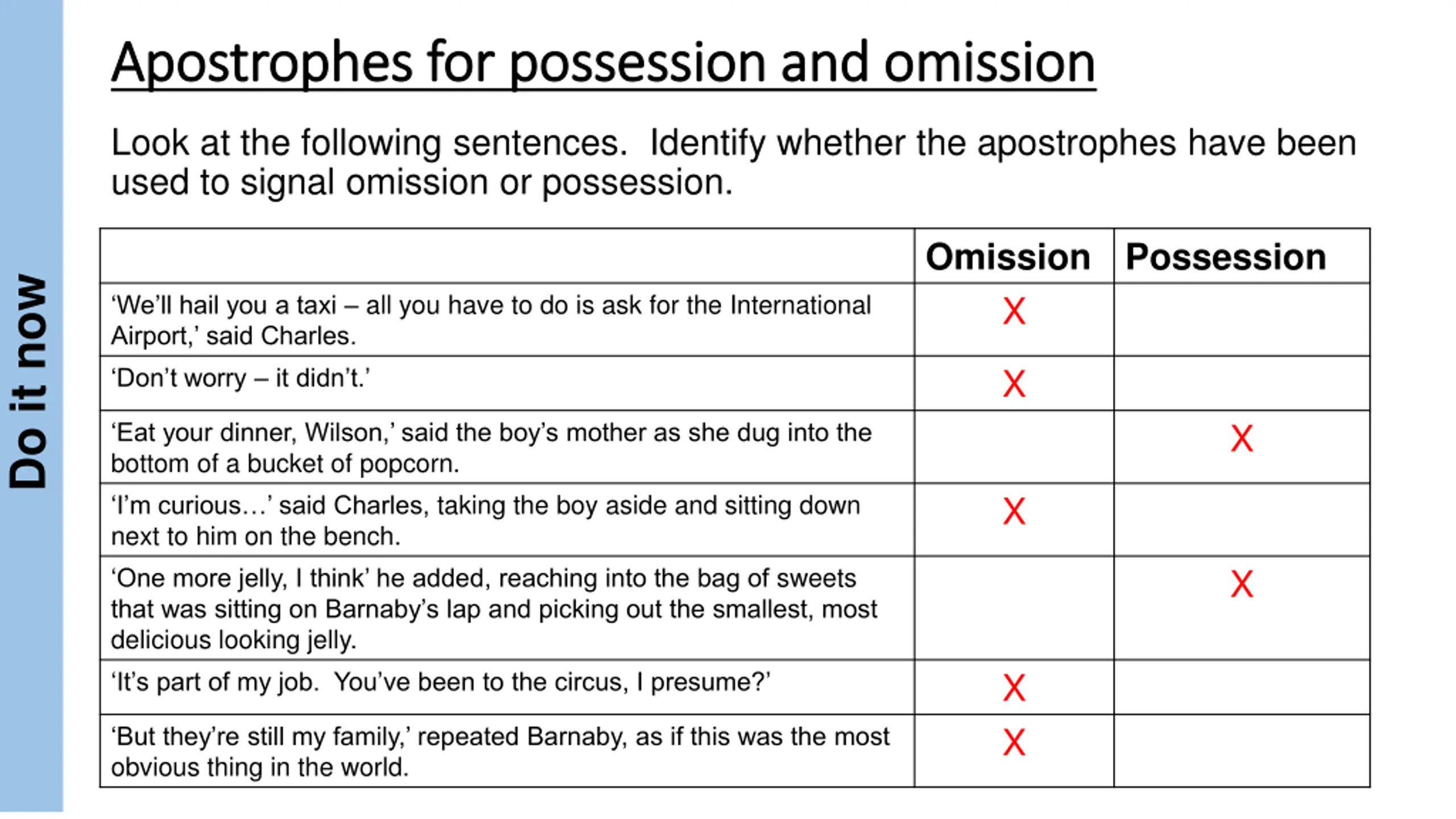 Apostrophes for possession and omission Apostrophes for possession and omission Look at the following sentences. Identify whether the apostrophes have been used to signal omission or possession. Omission Possession Do it now We ll hail you a taxi all you have to do is ask for the International Airport, said Charles. Don t worry it didn t. Eat your dinner,Wilson, said the boy s mother as she dug into the bottom of a bucket of popcorn. I m curious said Charles, taking the boy aside and sitting down next to him on the bench. One more jelly, I think he added, reaching into the bag of sweets that was sitting on Barnaby s lap and picking out the smallest, most delicious looking jelly. It s partof my job. You ve been to the circus, I presume? But they re still my family, repeated Barnaby, as if this was the most obvious thing in the world.