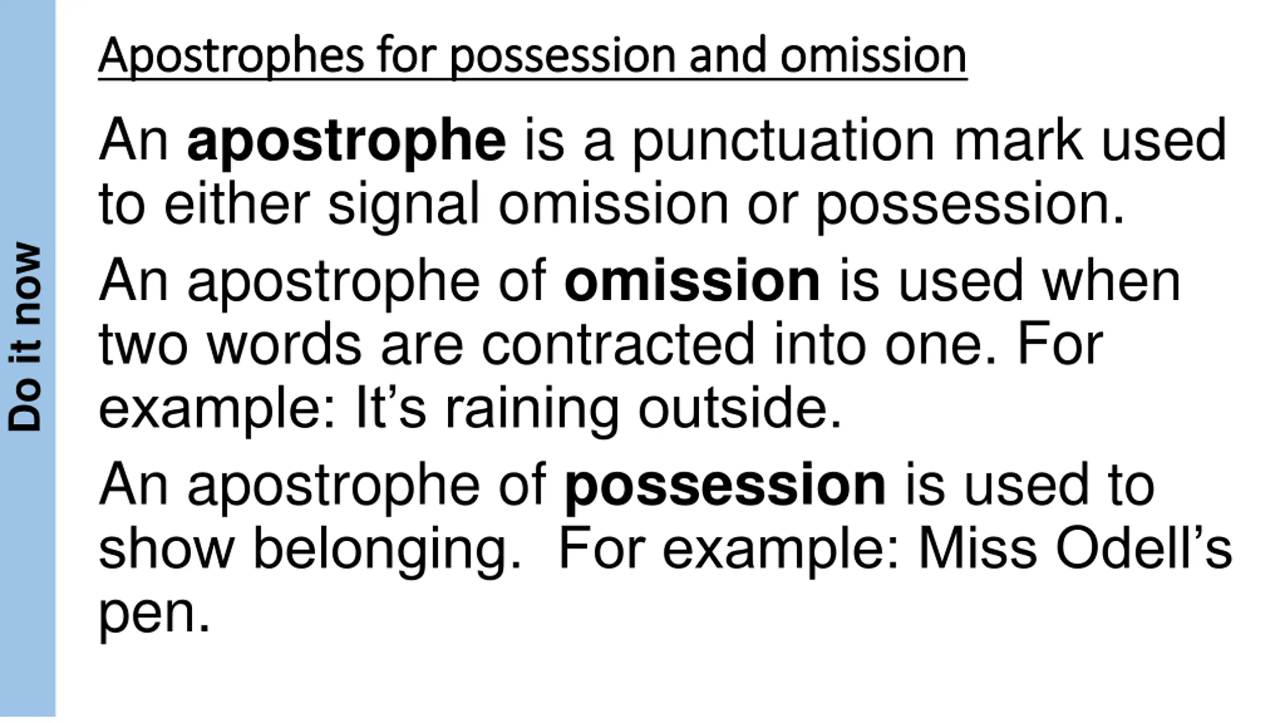 Apostrophes for possession and omission Apostrophes for possession and omission An apostrophe is a punctuation mark used to either signal omission or possession. An apostrophe of omission is used when two words are contracted into one. For example: It s raining outside. An apostrophe of possession is used to show belonging. For example: Miss Odell s pen. Do it now