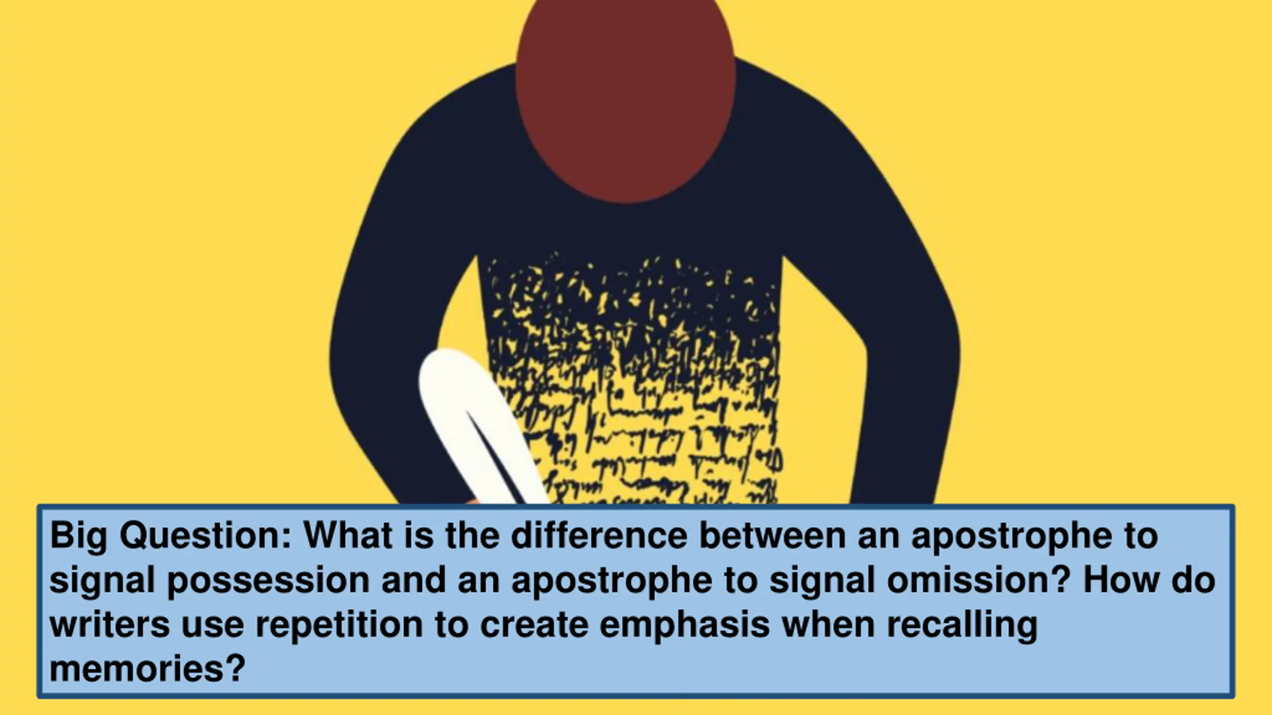 Big Question: What is the difference between an apostrophe to signal possession and an apostrophe to signal omission? How do writers use repetition to create emphasis when recalling memories?